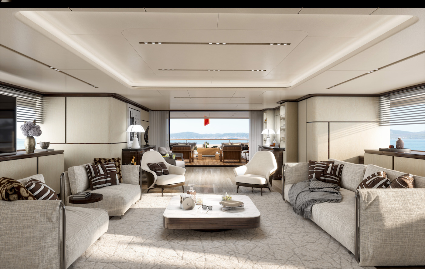 The main deck aft offers a shaded environment fitted with sofas and armchairs for effortless lounging in the fresh air.