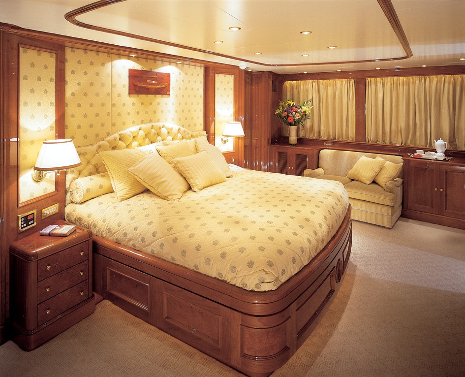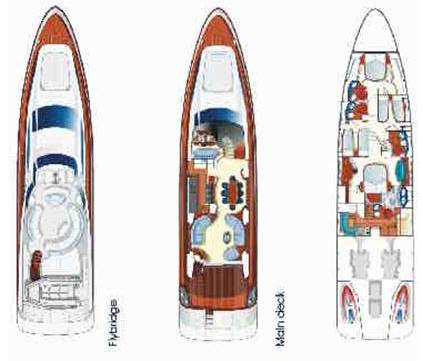 France based luxury motor yacht Felidan offers accommodation for 8 to 10 charter geusts. She has a master cabin which extends across the entire beam of the yacht and features its own seating area, writing desk, plasma TV, as well as a separate walk-in closet. As the cabin is conveniently situated on the main deck it's position ensures ease of access and plenty of daylight. The spacious bathroom with separate his and her entrance, whirlpool and central shower unit is the ultimate in sophistication. The roomy VIP cabin features its own seating corner, writing desk and plasma TV, as well as a bathroom with bath. Two additional twin bed cabins with Hi-Fi and DVD systems are also located on the lower deck. The bathrooms have showers with a massage jet. All cabins are provided with individually adjustable air-conditioning. 4. ACCOMMODATION Owners suite with double berth and ensuite bathroom /whirlpool and shower Guest cabins for six guests in three cabins all with ensuite bathrooms. One double VIP cabin and two twin cabins Guest accommodation available for a further two guests in the upper salon which has a double pull out berth. Spearate crew accommodation in four cabins for seven crew.