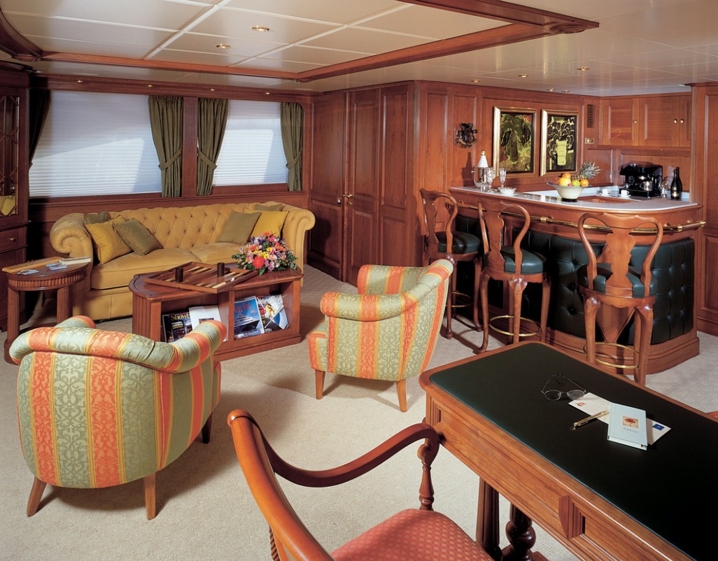 Situated immediately next to the saloon is the dining area and a small bar. The generously sized table can comfortably accommodate eight people. And no matter whether your preference is for nouvelle cuisine or exotic Asian dishes, our professional chef is happy to put together exquisite menus of your choice.