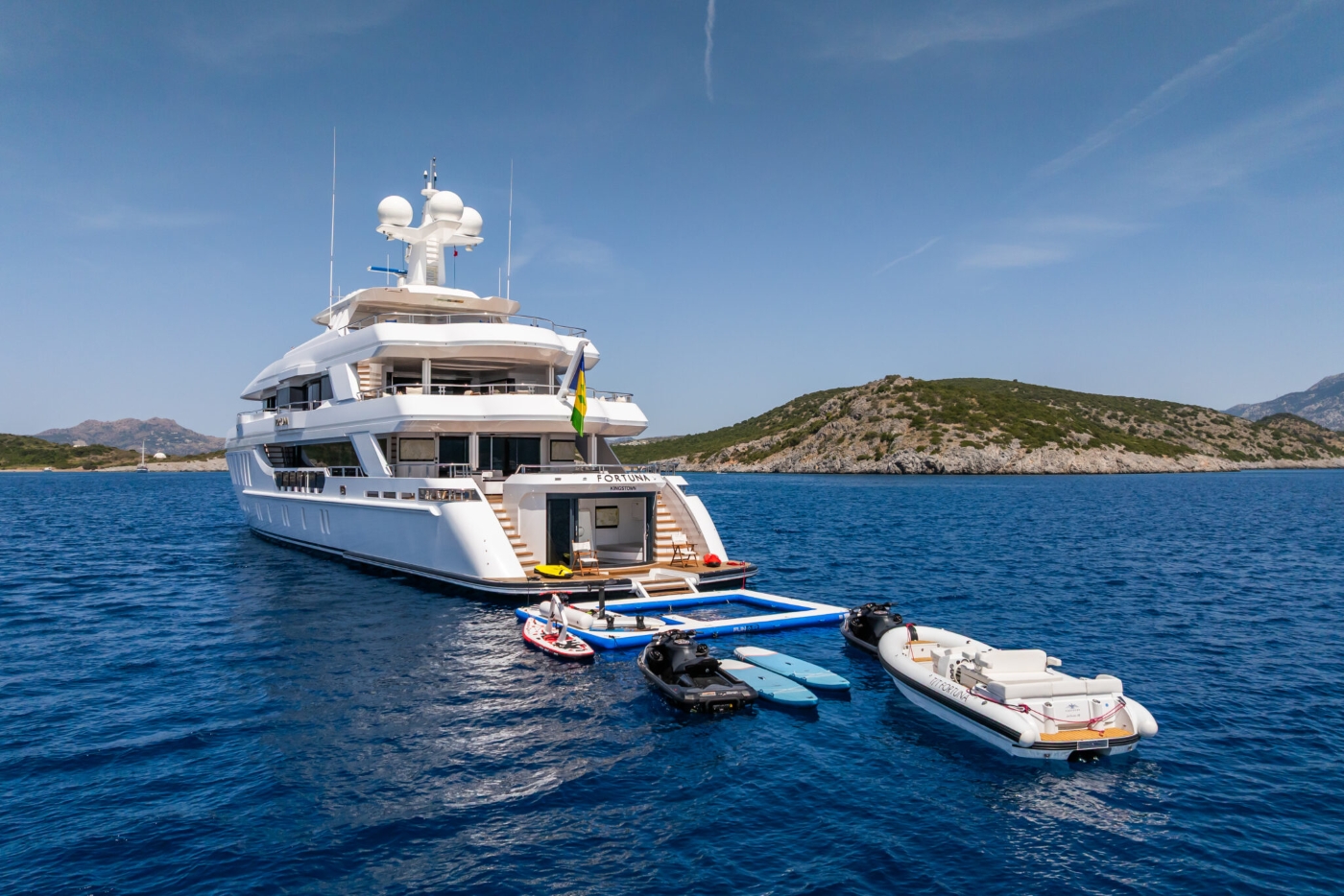 NOTABLE FEATURES OF FORTUNA: ~Tri-deck design ~Sun deck jacuzzi with waterfall ~Choice of al fresco dining ~Immaculate deck furnishings ~Beach club ~At anchor and underway stabilisers ~Air conditioning ~WiFi
