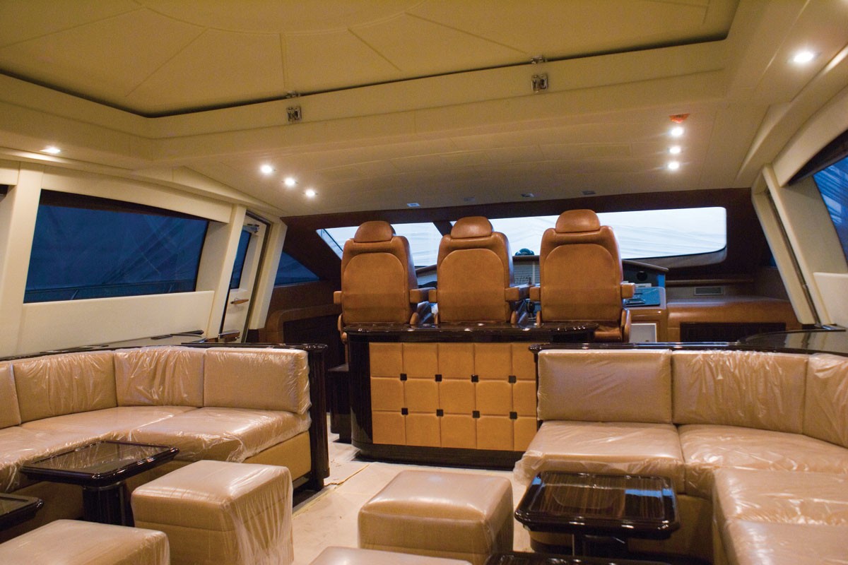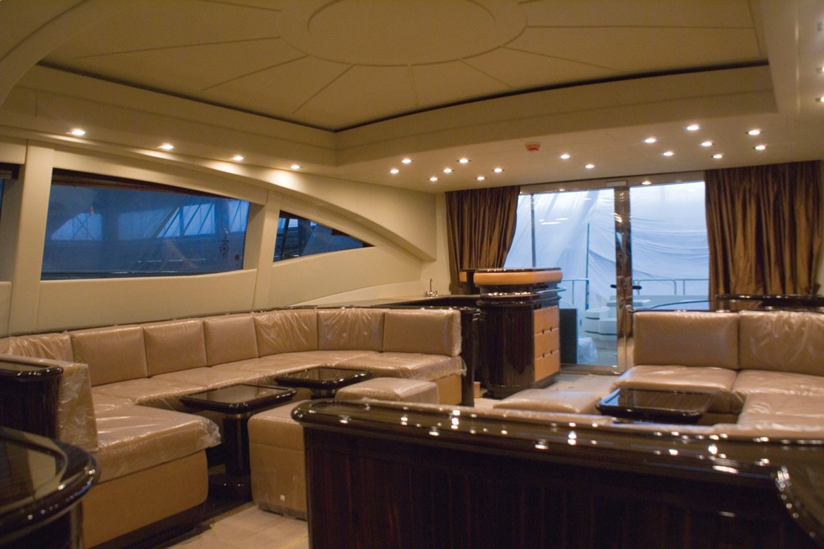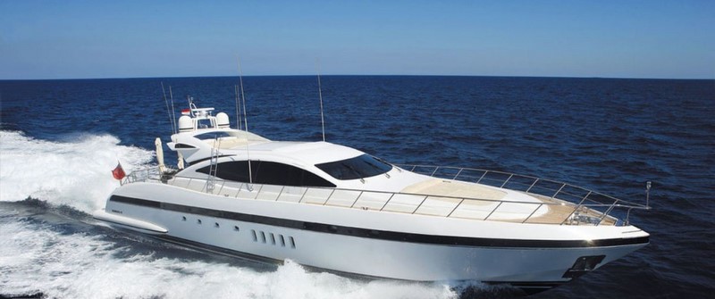The Mangusta 92´ super yacht has a GRP hull and superstructure. She is powered by twin MTU 2,400HP engines, reaching a top speed of 39 knots, with a cruising speed of 30 knots. Her beam is of 6.6m, while her draft is of 1.2m.