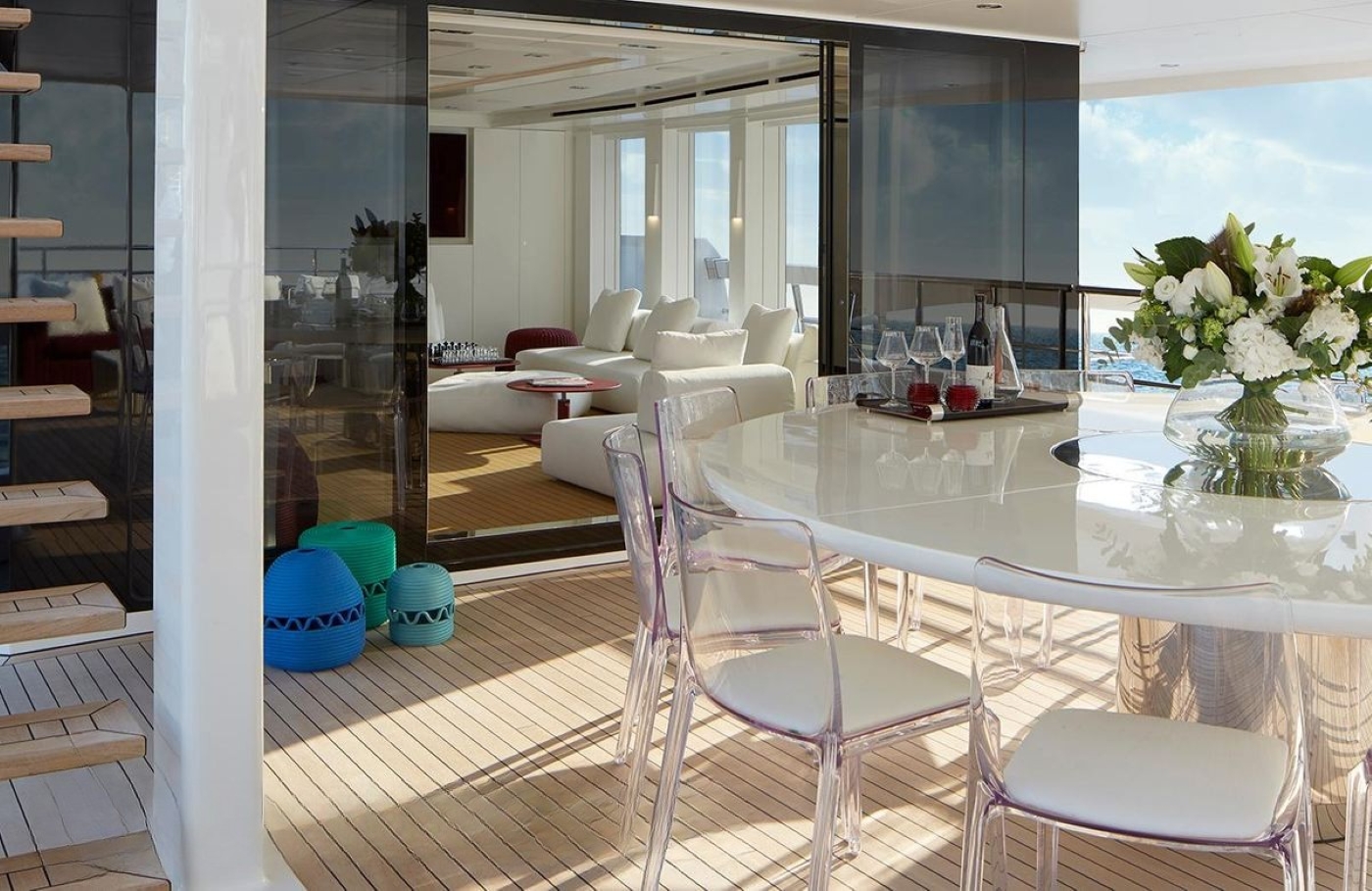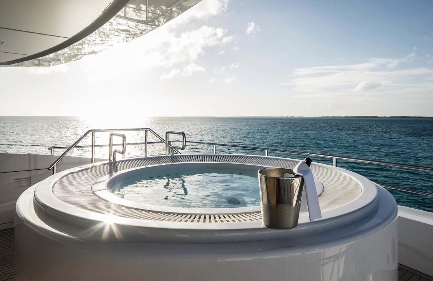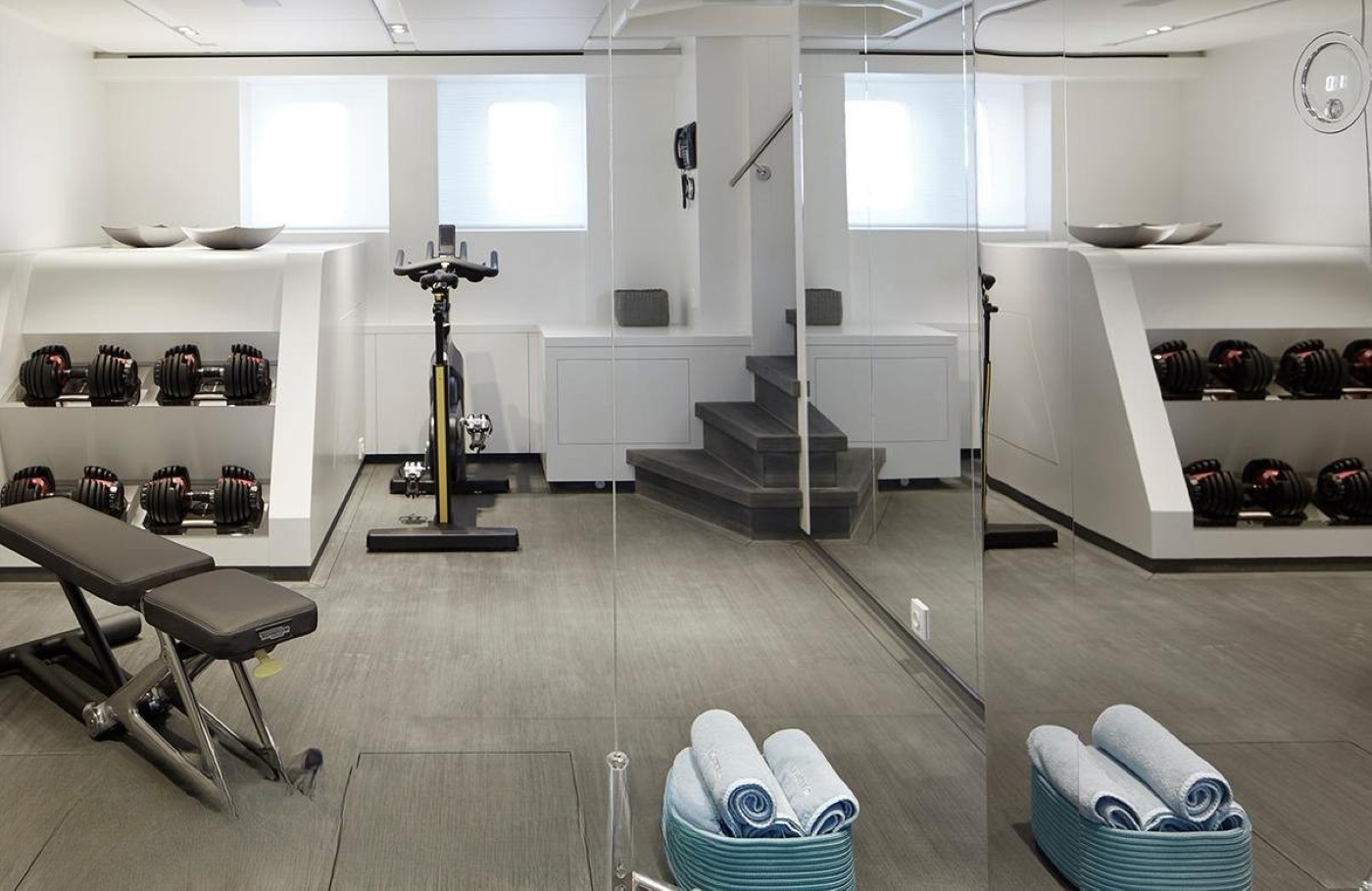 On the main deck of the luxury motor yacht Home, there is a spacious main salon with comfortable seating and dining areas. The lower deck has a fully equipped gymnasium and an engine room. The sundeck is a fantastic area for unwinding and leisure: there are a large wet bar and a spa pool for the guests to enjoy luxury cruising to the fullest. A large alfresco dining area is on the sun deck of the yacht.