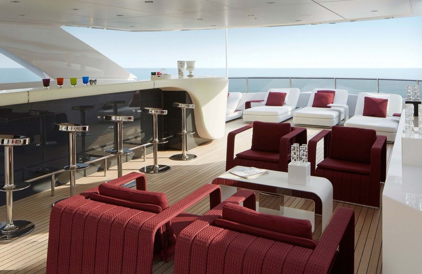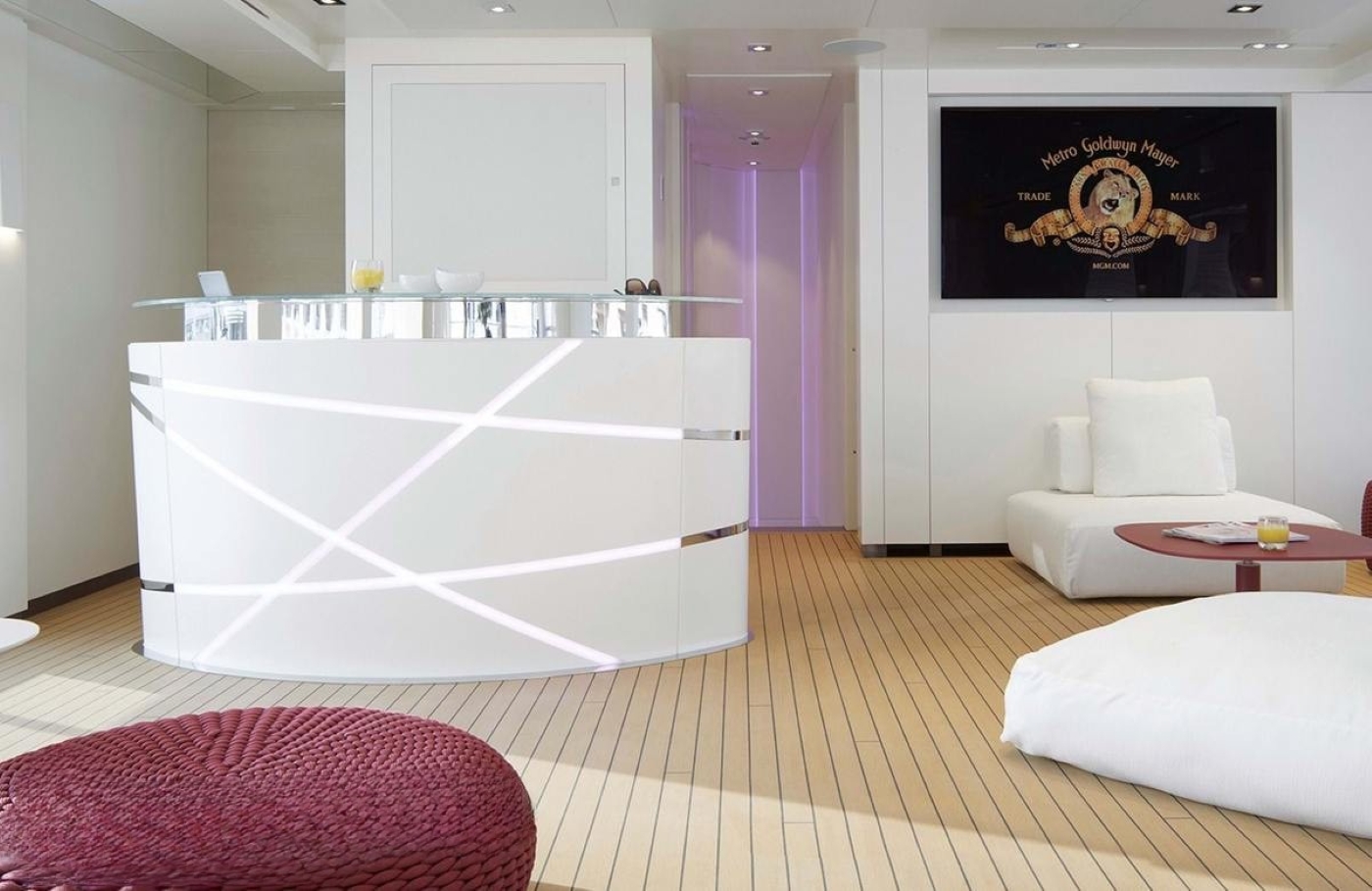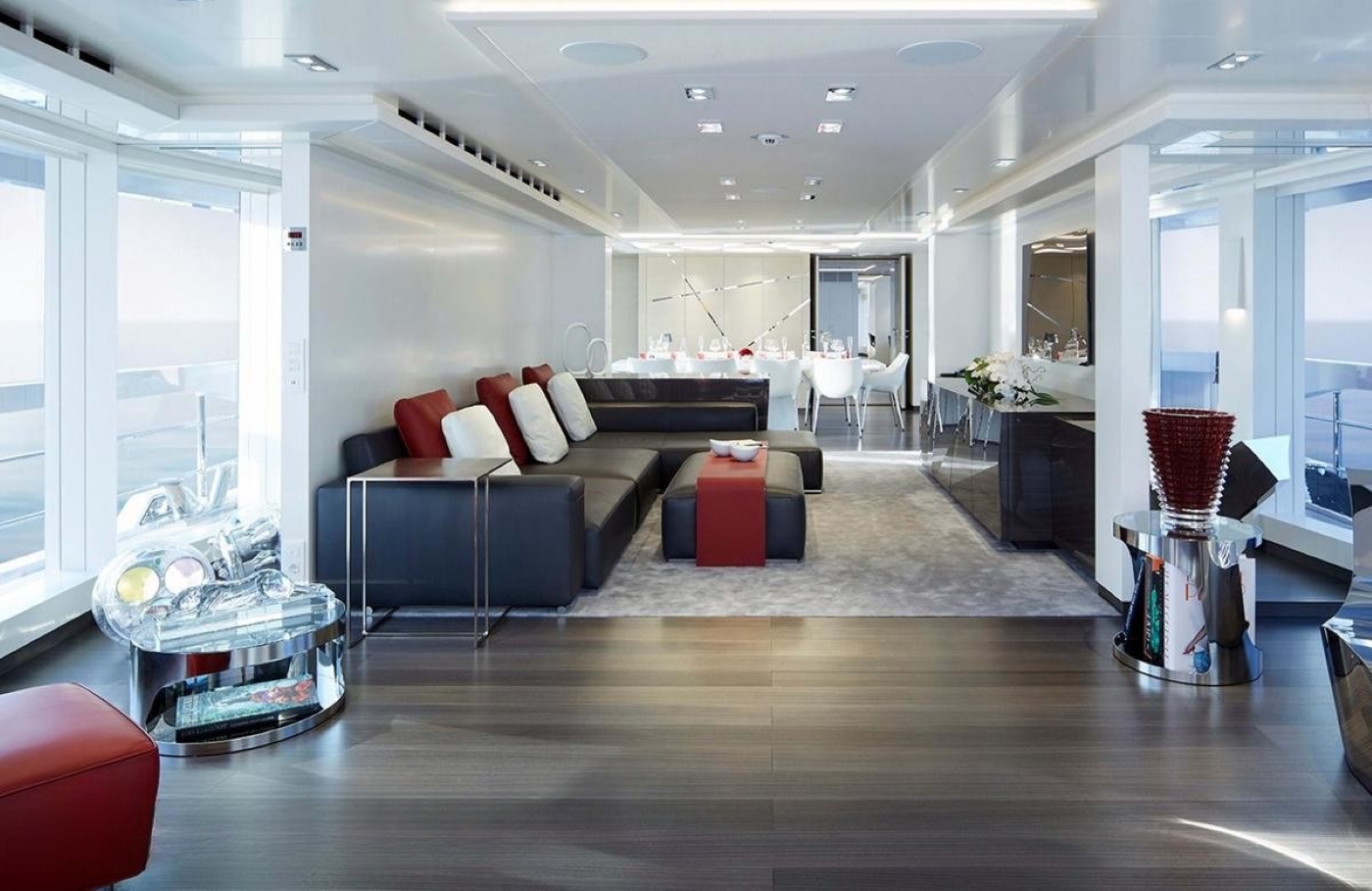 Omega Architects aimed to add some beach-villa style to the design of motor yacht Home. Thus, there is an extensive amount of glass and cutaway bulwarks to ensure plenty of natural light coming into the bright and airy interior. Cristiano Gatto worked on the minimalistic and modern design of Home's indoor living spaces. The dual-color palette was chosen to create light and relaxing ambiance, while some dark red and burgundy design elements would add to the lavish styling.