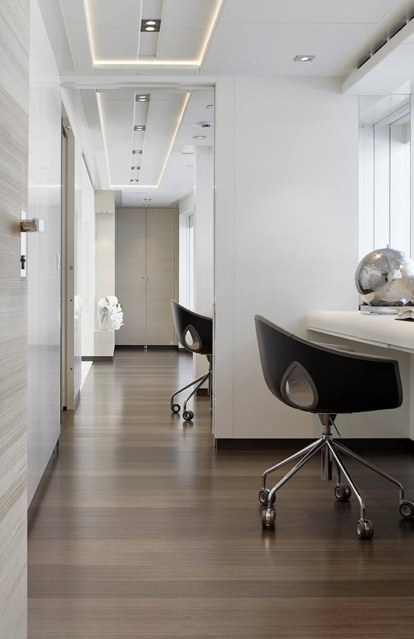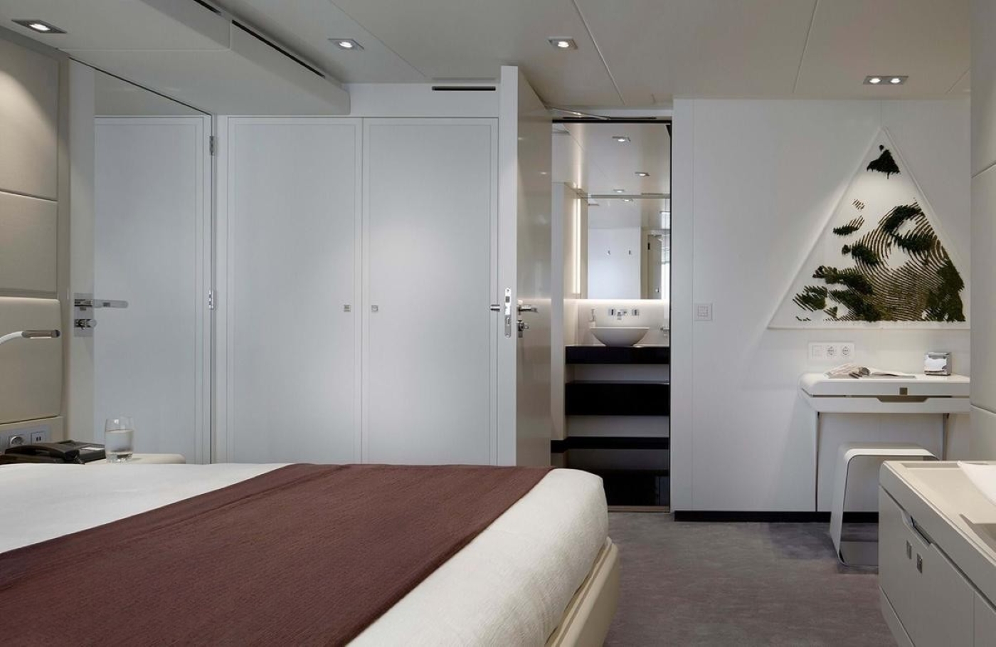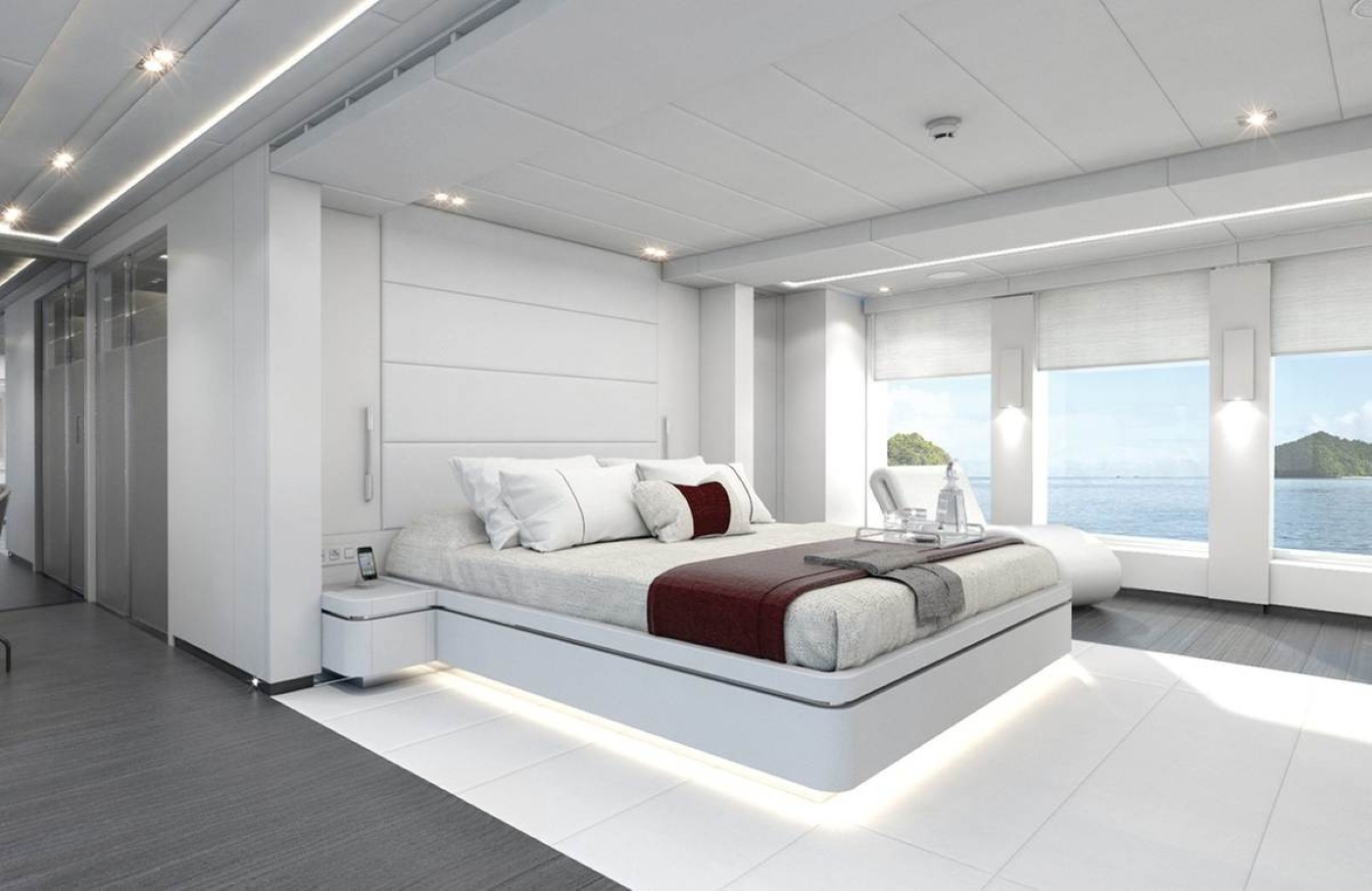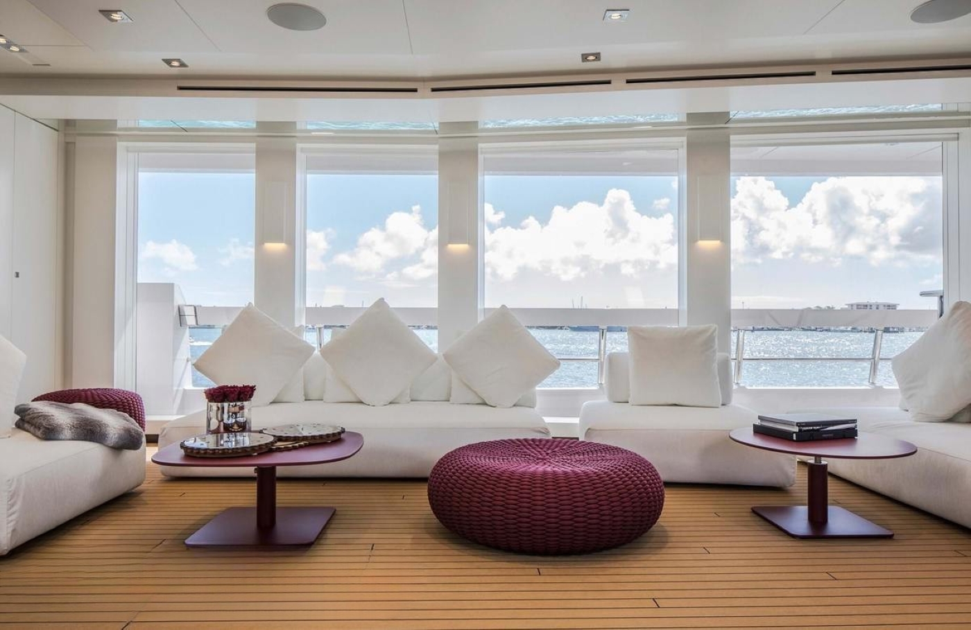 Omega Architects aimed to add some beach-villa style to the design of motor yacht Home. Thus, there is an extensive amount of glass and cutaway bulwarks to ensure plenty of natural light coming into the bright and airy interior. Cristiano Gatto worked on the minimalistic and modern design of Home's indoor living spaces. The dual-color palette was chosen to create light and relaxing ambiance, while some dark red and burgundy design elements would add to the lavish styling.