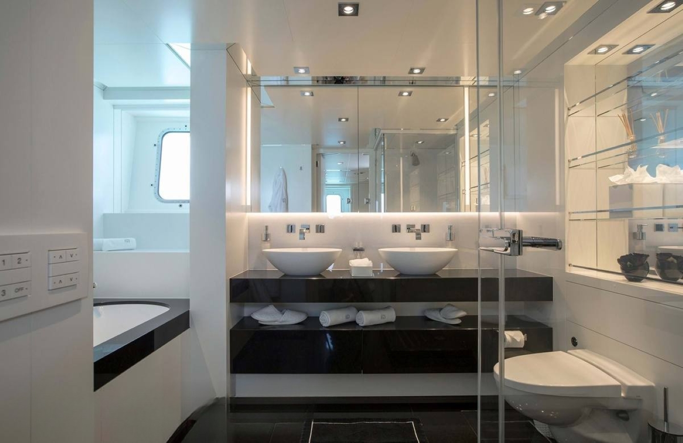 Accommodation aboard NOVA yacht is offered to up to 12 guests in 6 beautifully appointed cabins. These include the main deck master suite, featuring a bathroom with central bathtub. The lower deck hosts the additional guest cabins. There is a forward, full-beam VIP suite with a spacious bathroom with bathtub, two twin cabins located amidships, as well as two double cabins aft, both equipped with ensuite shower rooms.