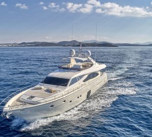 Delivered in 2008 by the Italian Ferretti group, 25,3m (83ft) motor yacht JULIE M is available for luxury yacht charter, accommodating up to 8 guests, in 4 ensuite cabins. The yacht has a professional crew of 4.