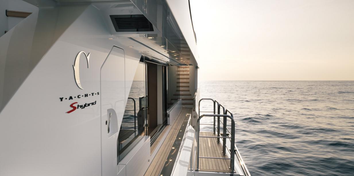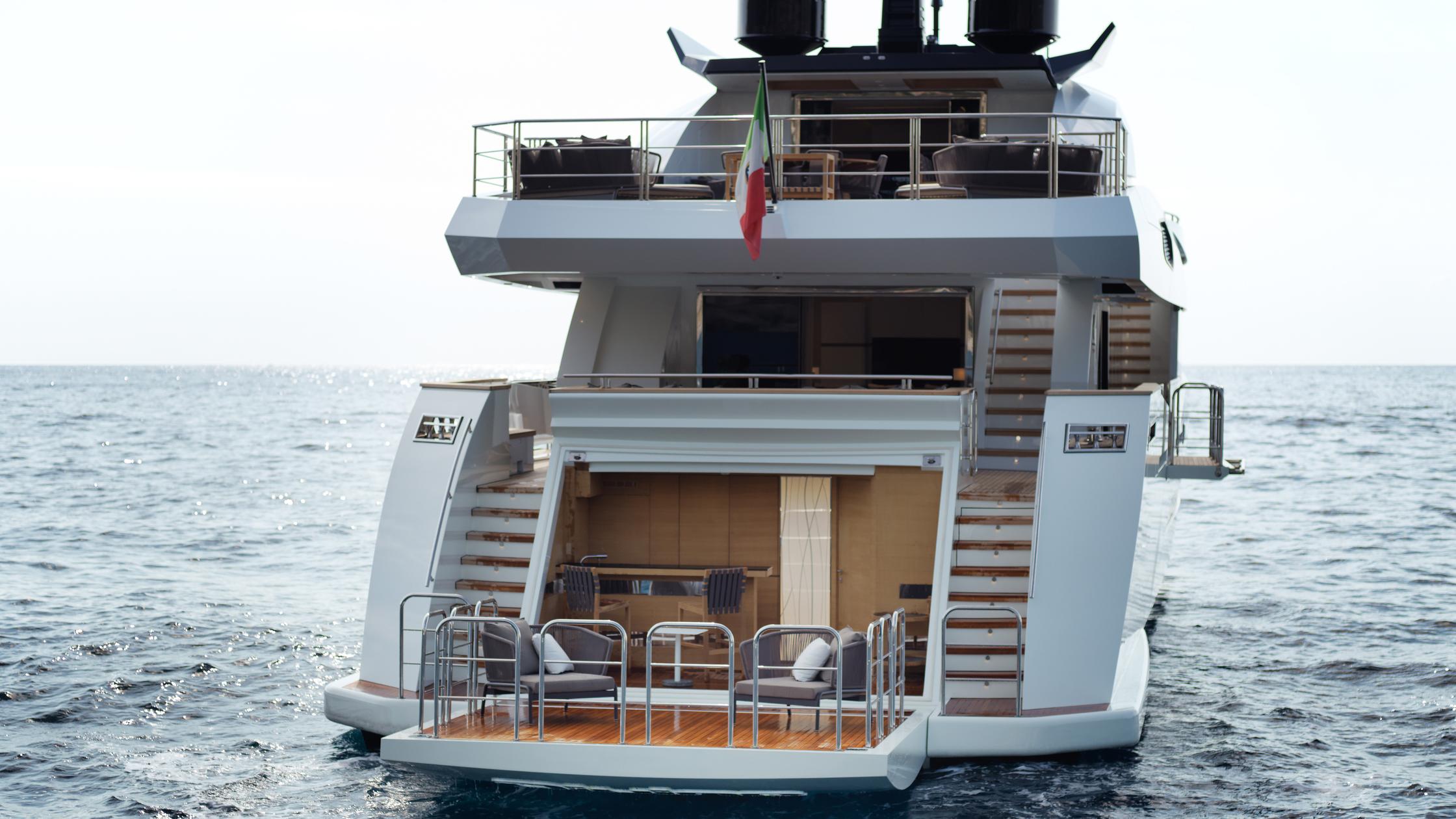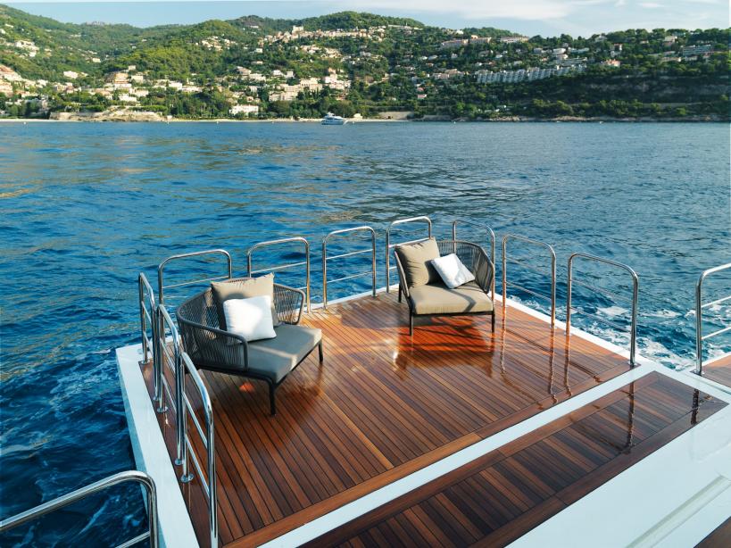The main deck is shaded by the upper deck overhang to create a space ideal for alfresco dining and outdoor living. A staircase on the port and starboard side connects the main deck to the upper deck and lower deck, where the transom door folds down to make a large swim platform and a terrace beside the water.
