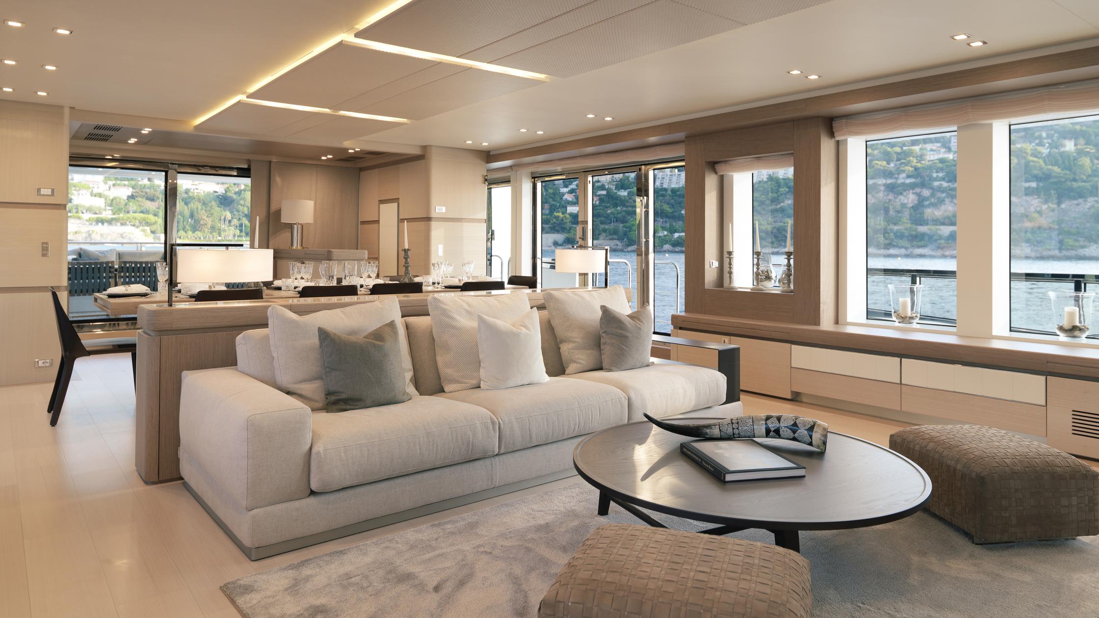 The main salon uses an open plan layout to increase the sense of volume, which is further enhanced by sliding doors on either side and each leads out onto a fold-down terrace for savoring the outdoor air while remaining close to the action. High-end furnishings from Fendi and Bentley decorate the room and ensure that guests have comfortable and stylish modern areas in which to unwind and dine.