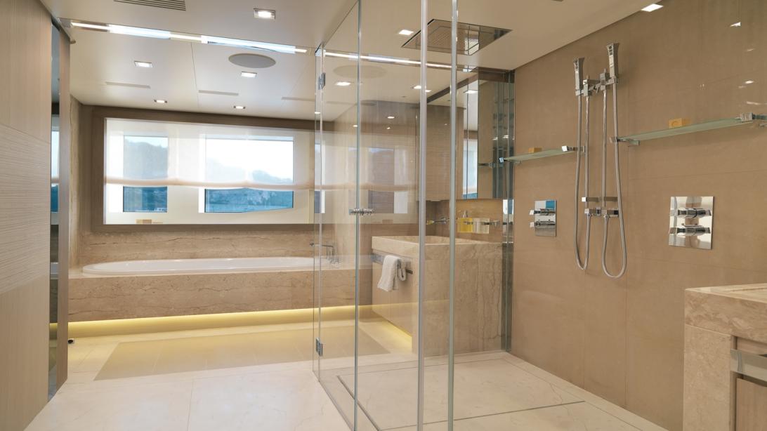 The accommodation sleeps up to 11 guests over 5 cabins: 1 Master suite, 1 full-beam convertible VIP stateroom, 1 double cabin and 2 twin cabins. The crew accommodation provides for up to 7 over 4 cabins.