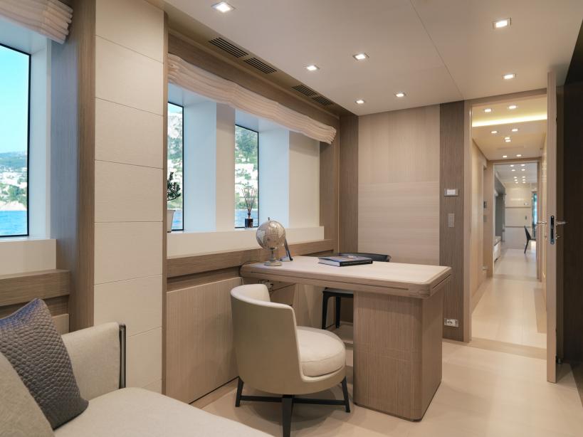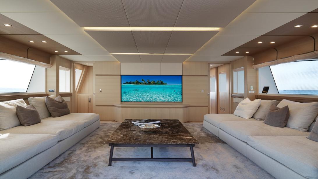 On the upper deck, the aft section is dedicated to relaxing in the sunshine and is laid out with outdoor seating and sun loungers as well as an informal dining setup. On the extended bow, there are a Jacuzzi offering steps for ease of access. Forward to the Jacuzzi, a bench tabletop and soft seating add the place for guests to spend time outdoors surrounded by panoramic views.