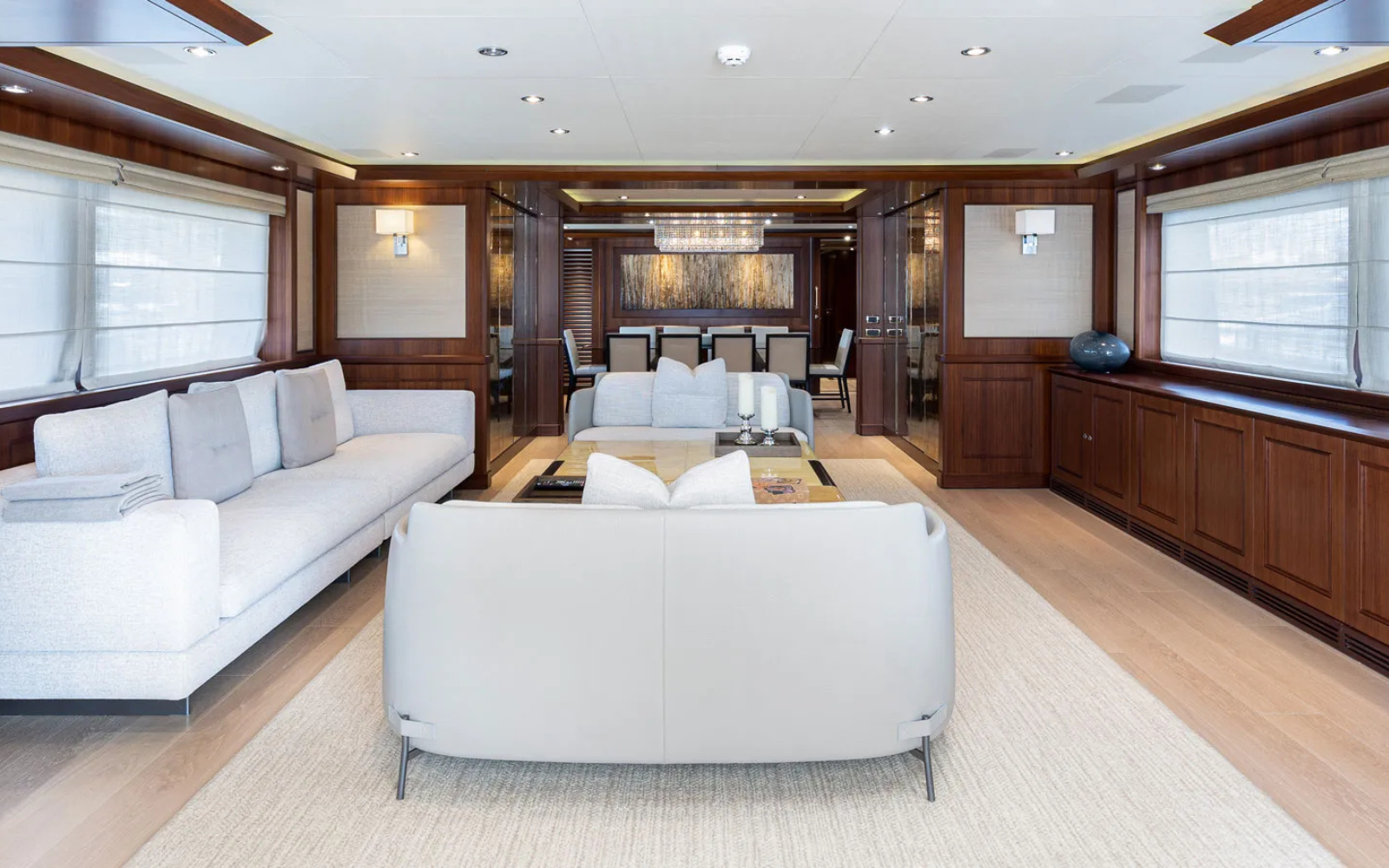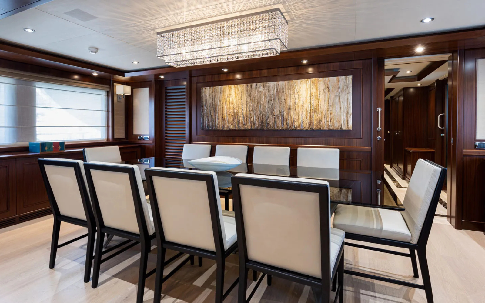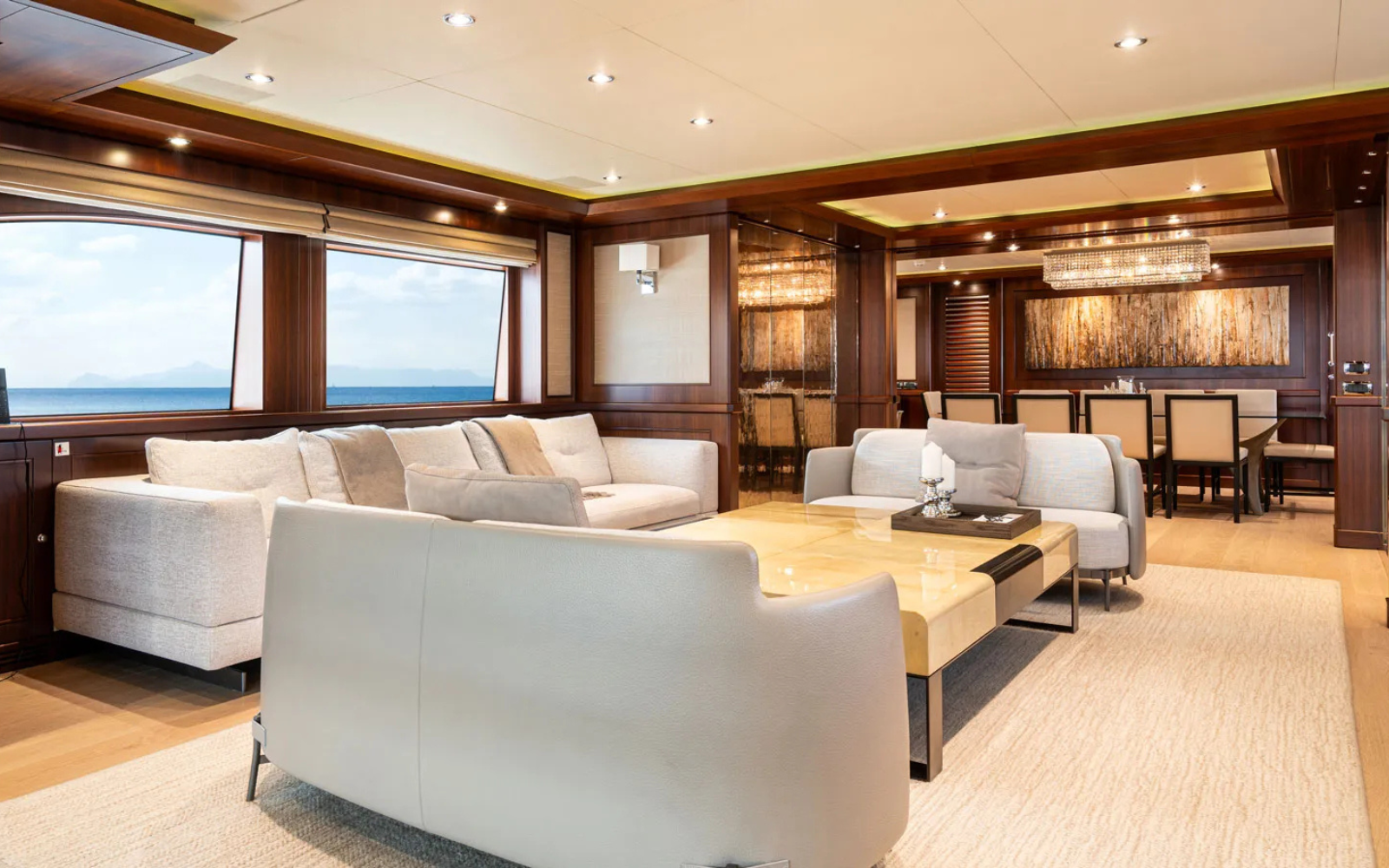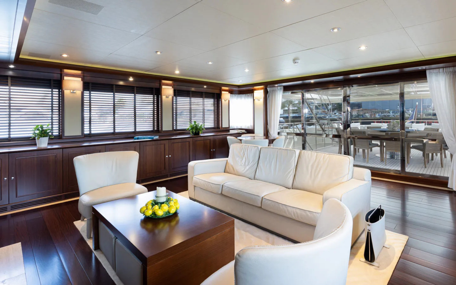 Lady Genyr features four spacious decks as well as a new layout of the sun deck. Among its unique features is the internal lift linking the decks, expressly requested by the Owner. A distinctive feature of this vessel is the Owner’s suite terrace designed as a “balcony” with coffee tables and armchairs for breakfast, to be enjoyed while cruising. Her interior can be characterised as classic timeless, providing Lady Genyr with a design of sharp elegance.