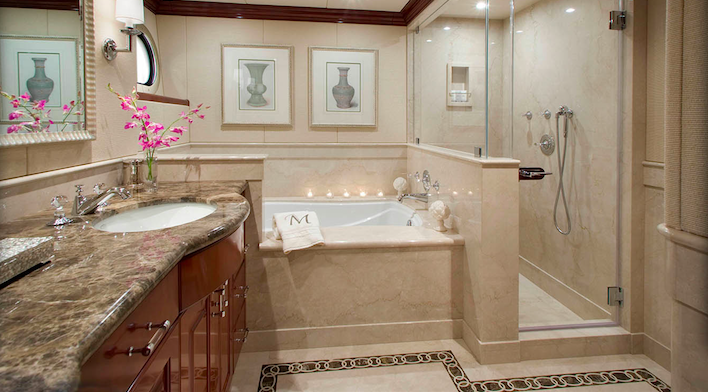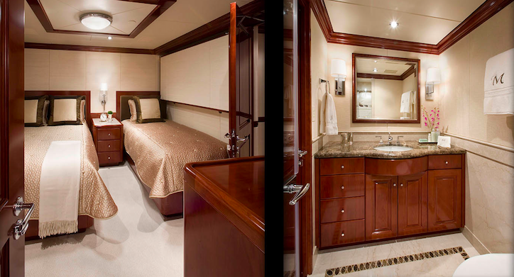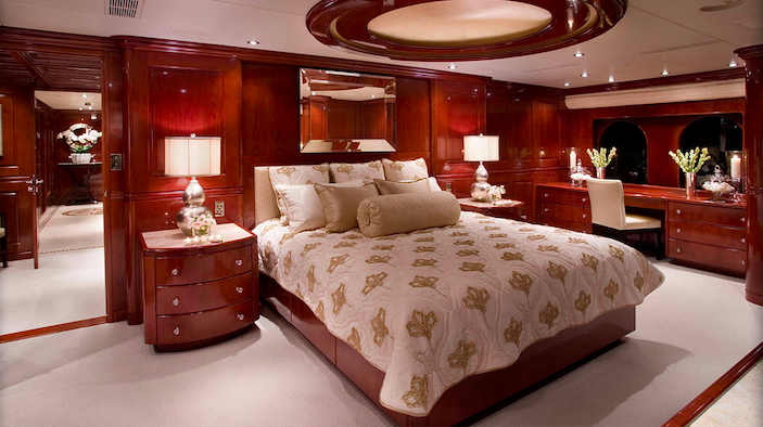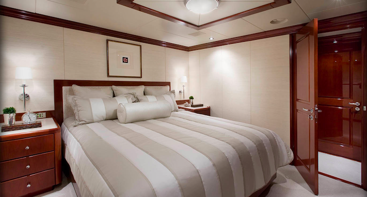 Deluxe accommodation is provided to 12 guests in 6 sumptuous staterooms, with very elegant en-suite facilities. The master suite is located forward, and features a large King-sized bed, his and hers en-suite facilities with a tub and a separate shower. There is also a comfortable sitting area as well as a walk-in closet from the bathroom or the stateroom. The VIP, two double and two twin staterooms are all located below deck.
