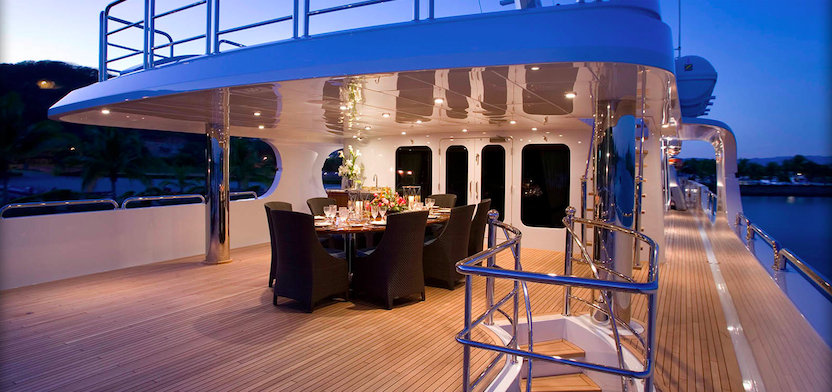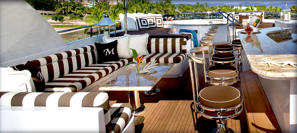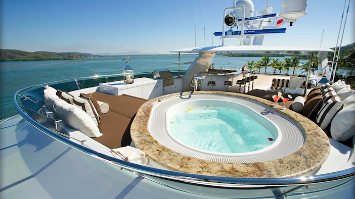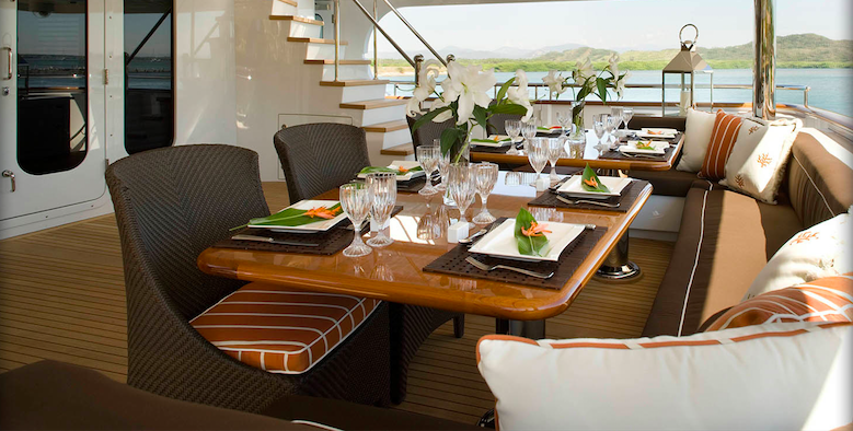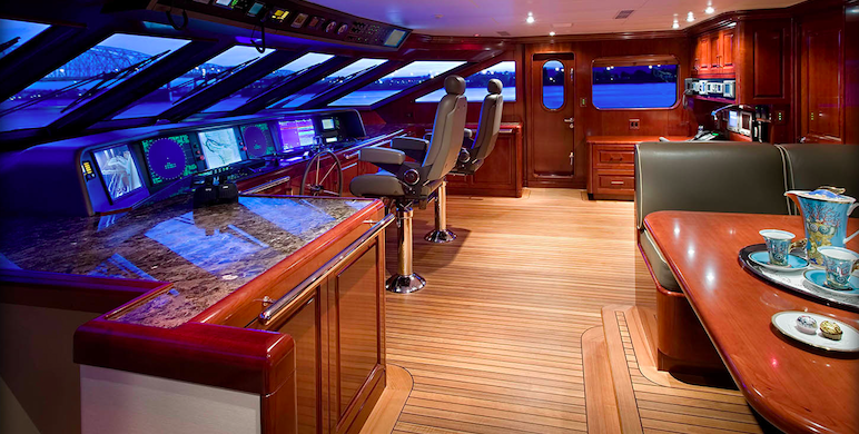 The sun-deck aboard Christensen 157’ LADY JANET yacht features a popular Spa Pool tub and large cushioned sun-pad, a BBQ grill, a bar with stools as well as a banquette for casual al-fresco dining for twelve guests. Water toys and equipment are carried by the spacious aft deck. The bridge-deck boasts a sky-lounge bar, a game table and a comfortable conversation/relaxation area. Aft bridge is able to accommodate 12 guests for al-fresco dining.