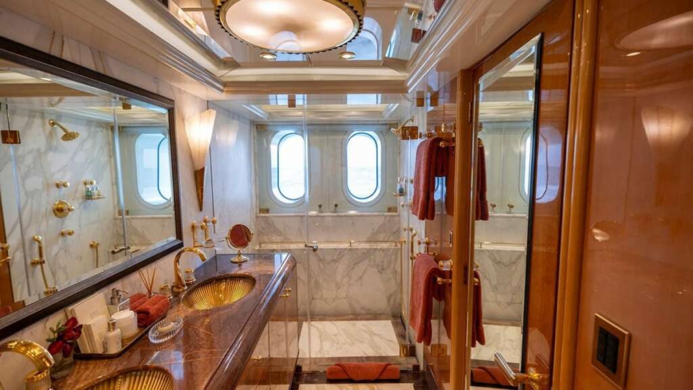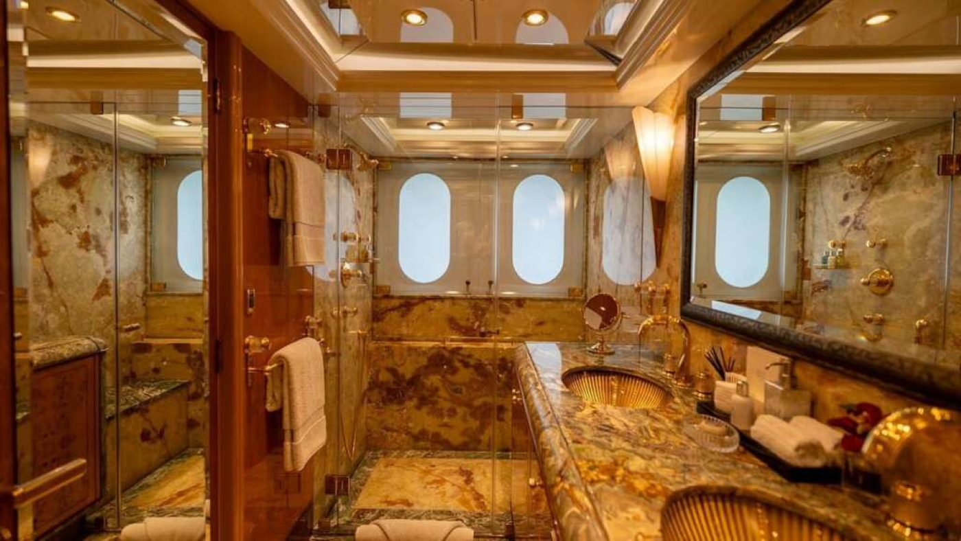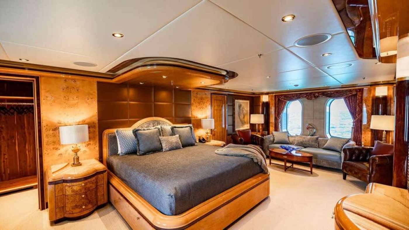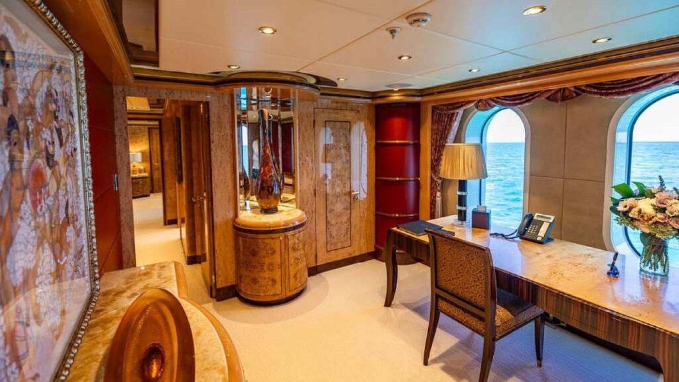 Her interior living spreads over 3 capacious decks, offering plenty of areas to socialize and relax. On the main deck is the open plan salon and formal dining, boasting a warm ambience and elegant décor of fine woods such as Birch and Burl, as well as the finest in silk carpets. The salon space offers plush seating, occasional chairs and a coffee table. Further aft is a complete wet bar and direct access to aft deck with alfresco dining for 12. Forward of the salon lounge is a stylish formal dining table, seating up to 12 guests with ease. The entire space is surrounded by panoramic windows ensuring optimum natural light and unrivalled views. A day head is available on the starboard side foyer. Additionally, the master stateroom is on the main deck, spreading a full beam of the yacht forward and featuring a private study, large marble ensuite with shower and a Jacuzzi tub. The master stateroom boasts a further private ensuite with a tub.