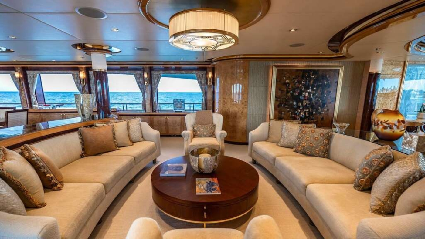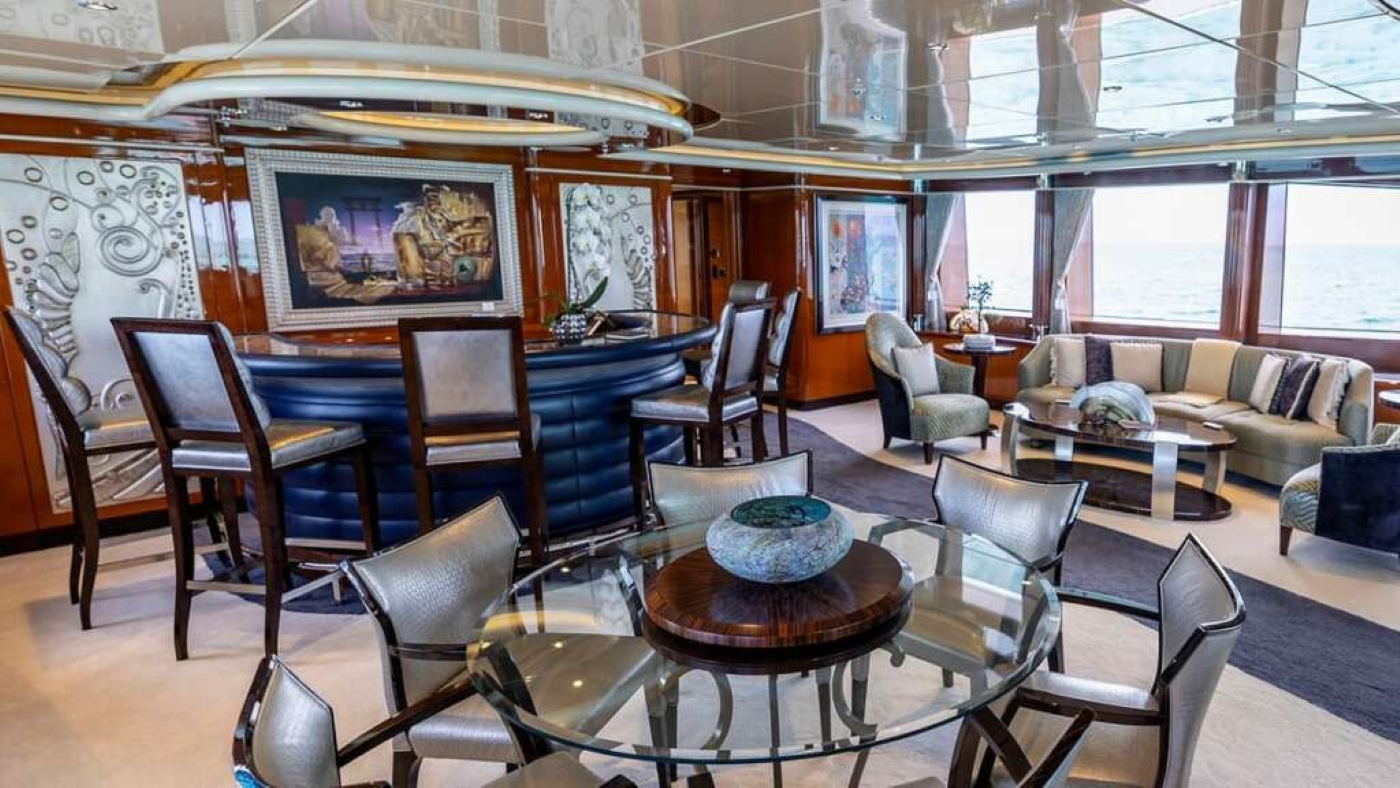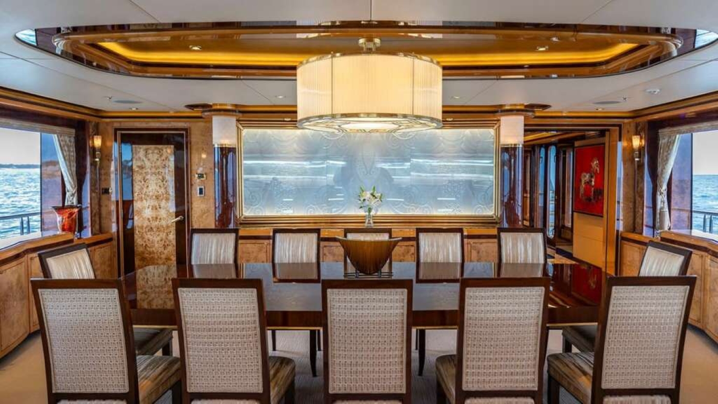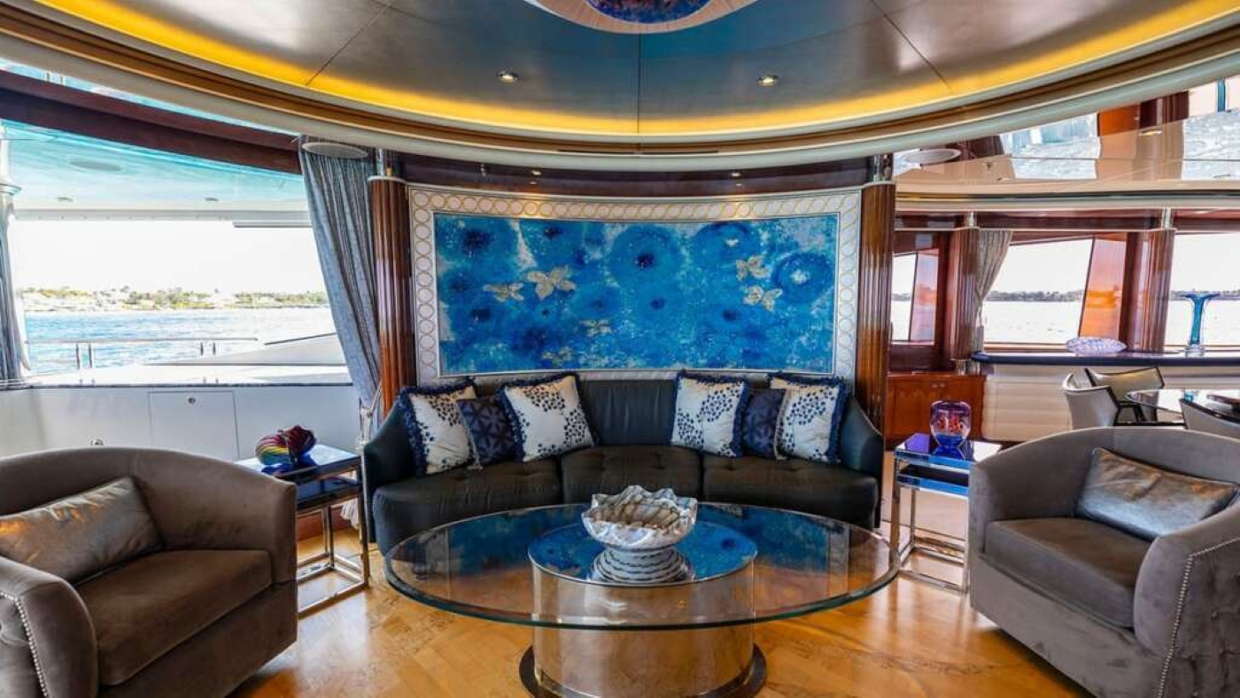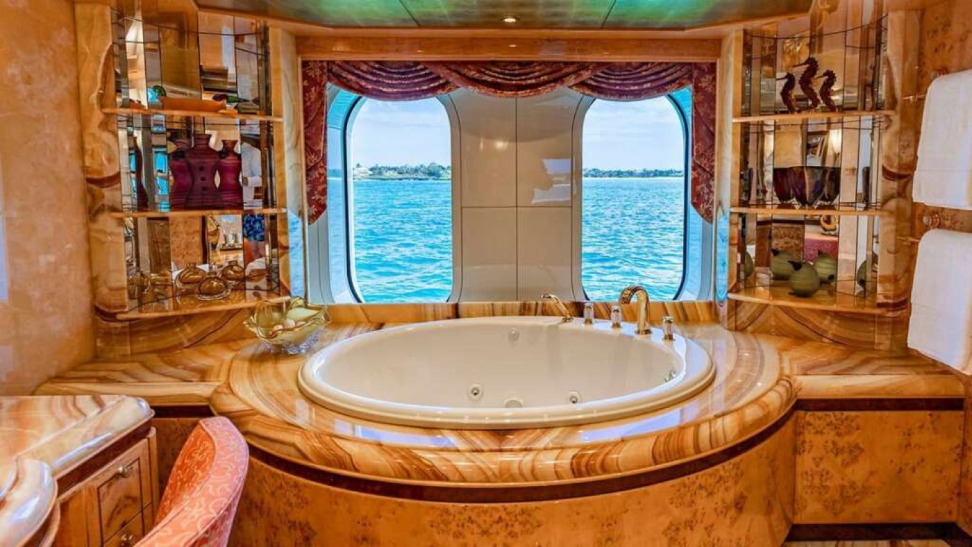 Her interior living spreads over 3 capacious decks, offering plenty of areas to socialize and relax. On the main deck is the open plan salon and formal dining, boasting a warm ambience and elegant décor of fine woods such as Birch and Burl, as well as the finest in silk carpets. The salon space offers plush seating, occasional chairs and a coffee table. Further aft is a complete wet bar and direct access to aft deck with alfresco dining for 12. Forward of the salon lounge is a stylish formal dining table, seating up to 12 guests with ease. The entire space is surrounded by panoramic windows ensuring optimum natural light and unrivalled views. A day head is available on the starboard side foyer. Additionally, the master stateroom is on the main deck, spreading a full beam of the yacht forward and featuring a private study, large marble ensuite with shower and a Jacuzzi tub. The master stateroom boasts a further private ensuite with a tub.