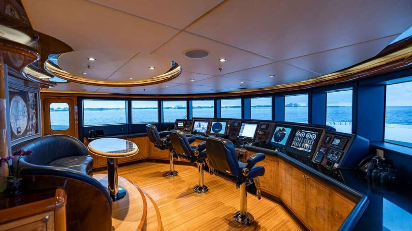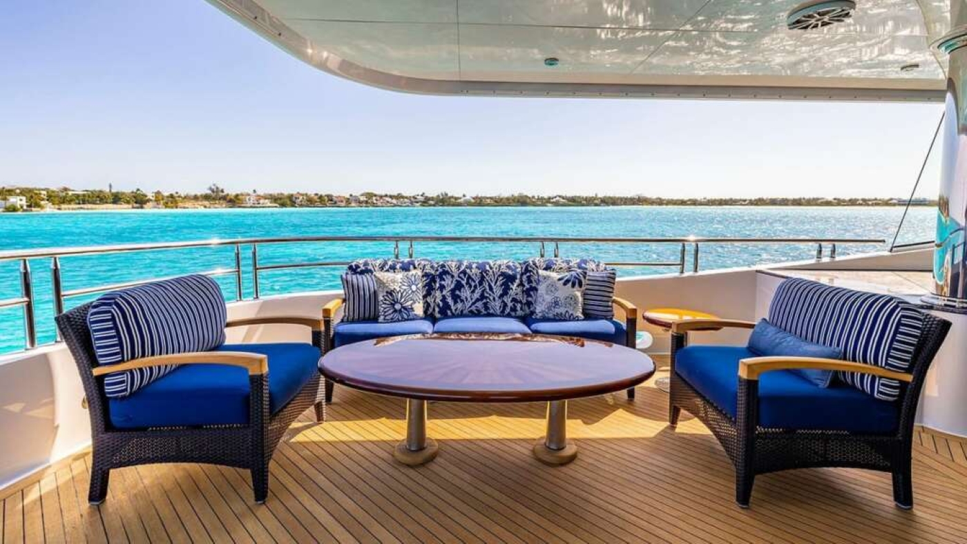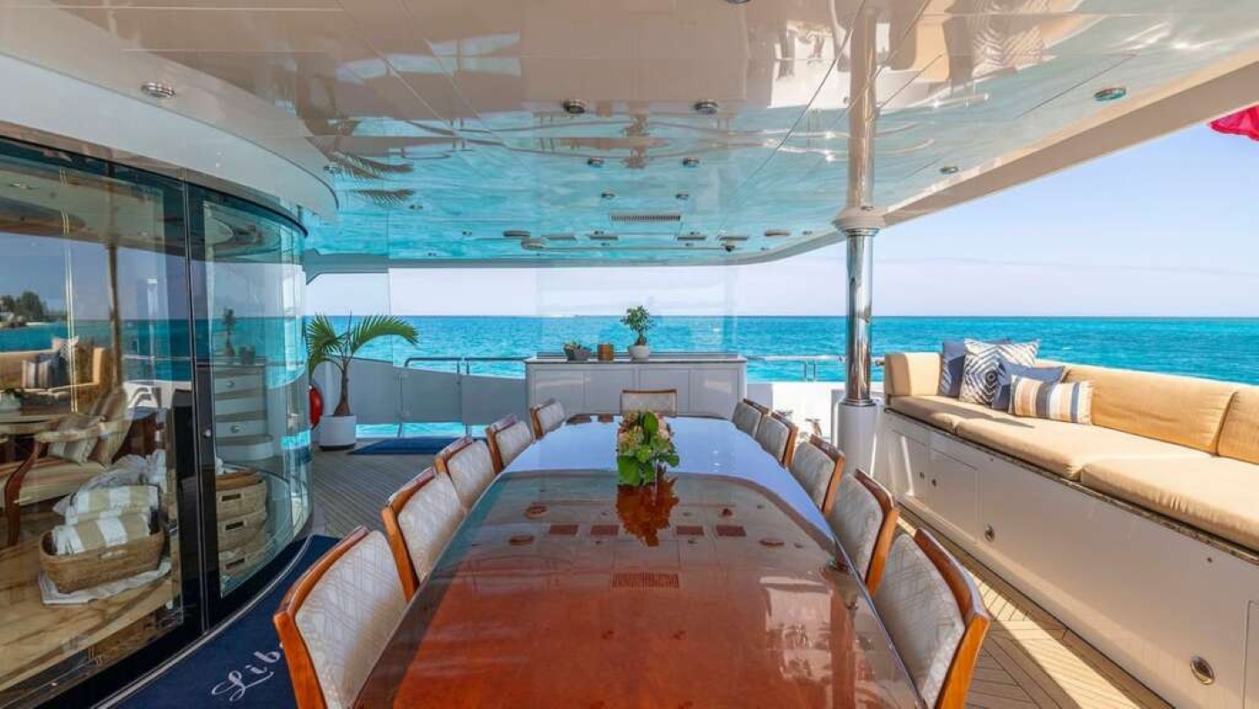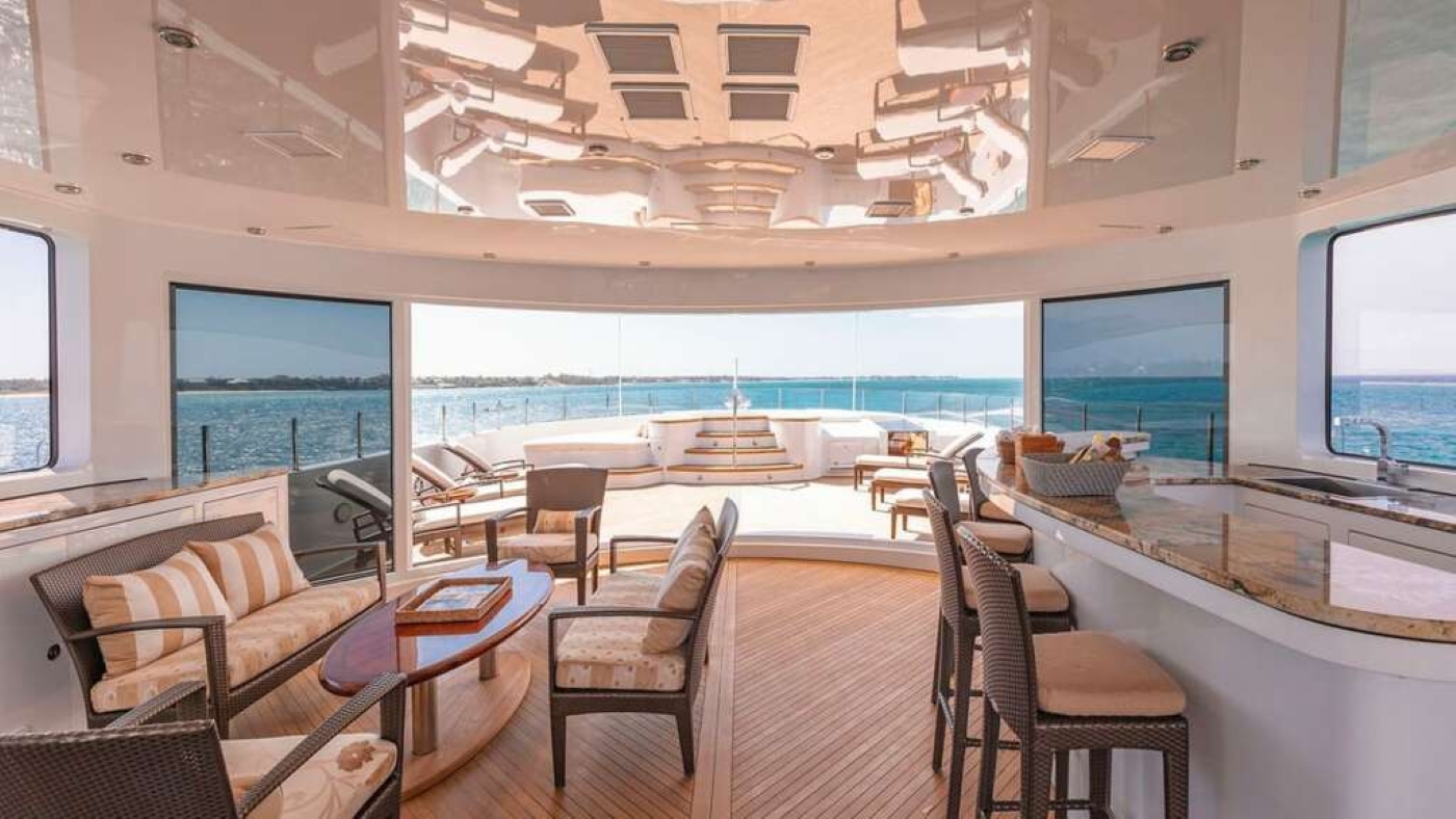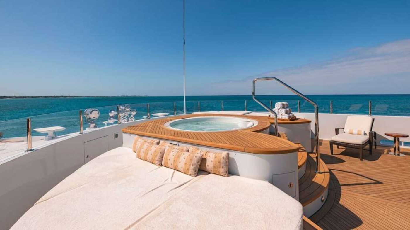The sundeck’s aft area has modern gym equipment for the fitness inclined, while amidships is a shaded deck space with seating, tables and a wet bar. Forward is a generous deck area, with chaise lounges, sun pads and a deluxe Jacuzzi tub. All 3 exterior decks are laid in timeless teak.