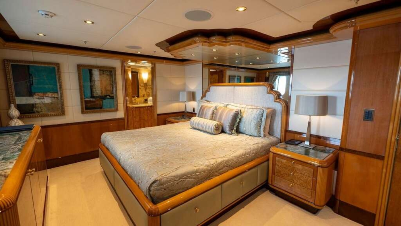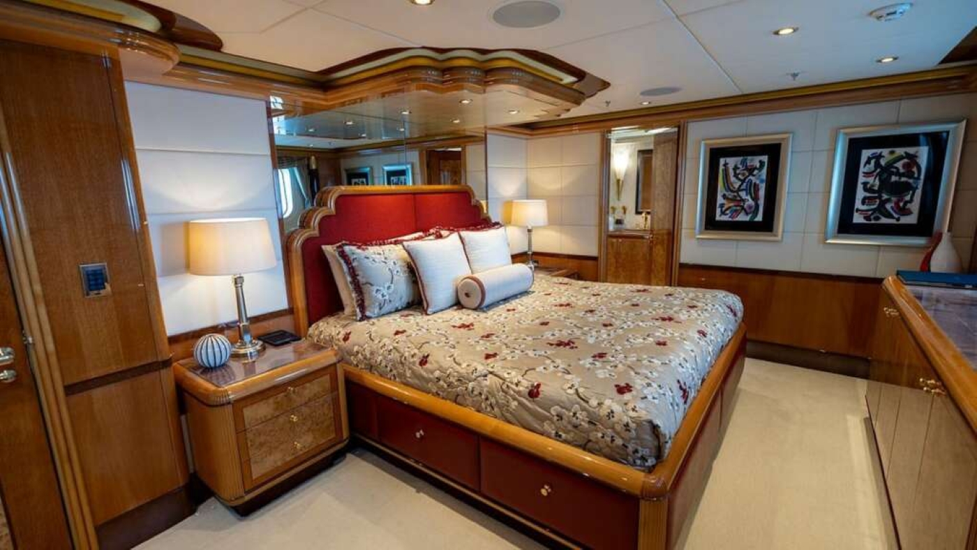Accommodation is in 6 spacious elegant cabins, for up to 12 guests. The master stateroom is full beam of the yacht on the main deck and forward, featuring a king size bed, sofa, private study and his and hers bathrooms, one with tub and shower, the other with tub. The master cabins large windows provide ample natural light. A Queen cabin is on the bridge deck aft of the bridge helm station, this cabin easily converts into a gym or massage room, thanks to the Murphy design bed. On the lower deck are 4 double cabins, consisting of 4 king size beds, each offering private ensuite facilities.
