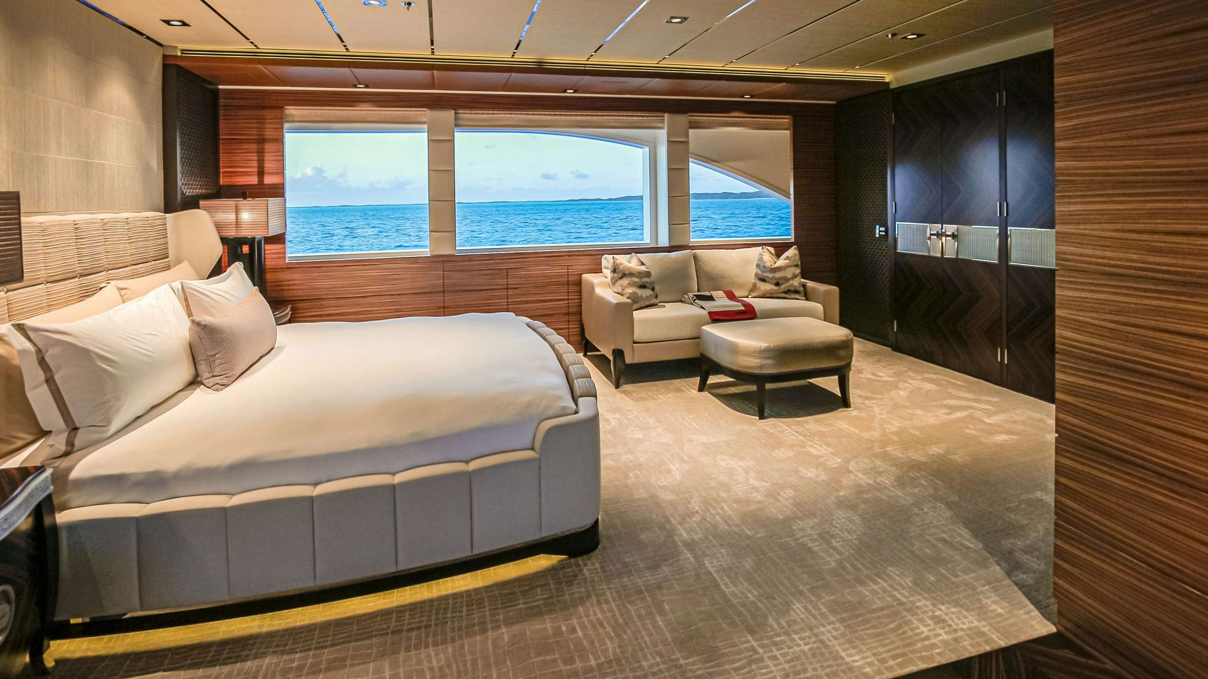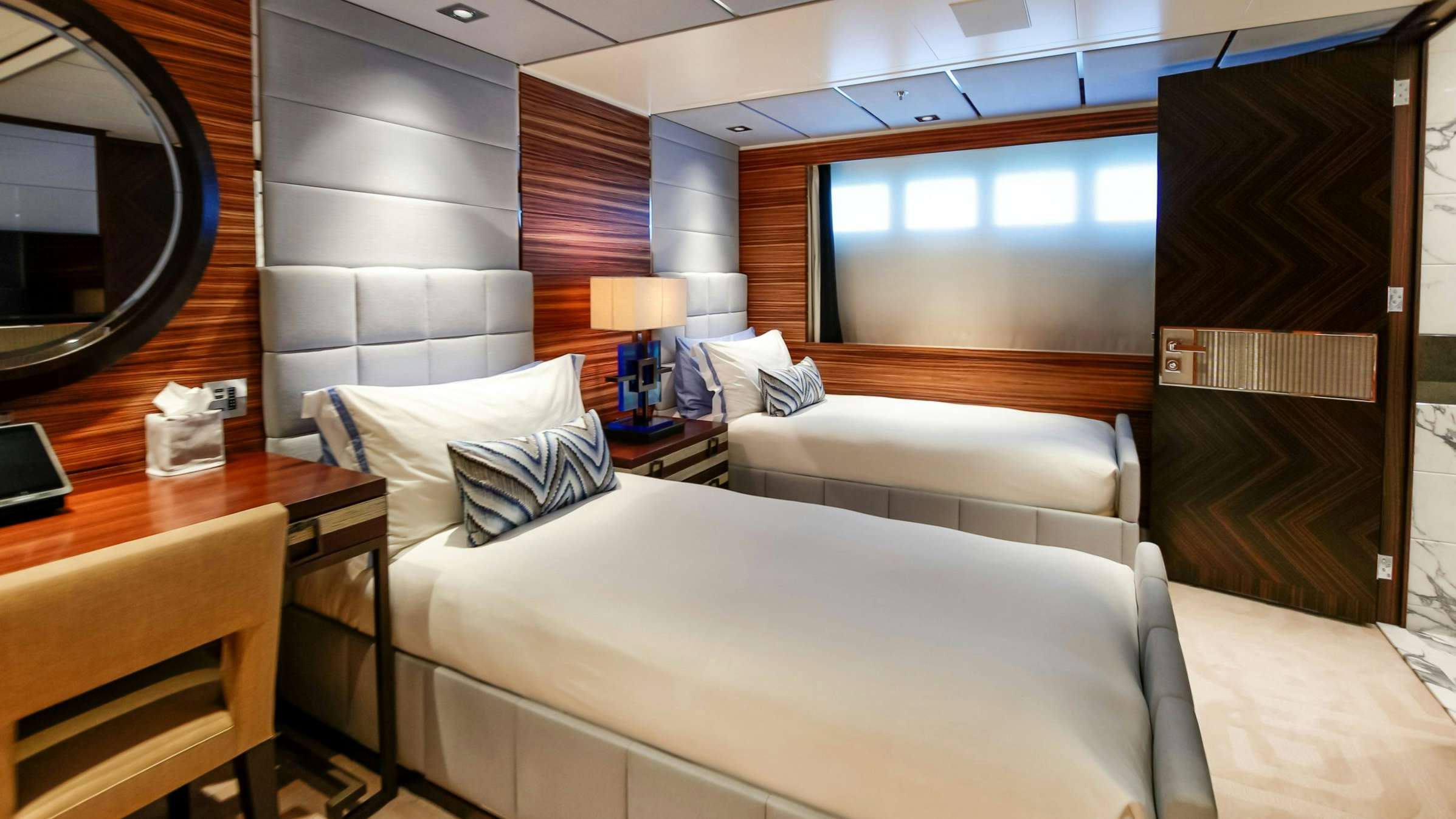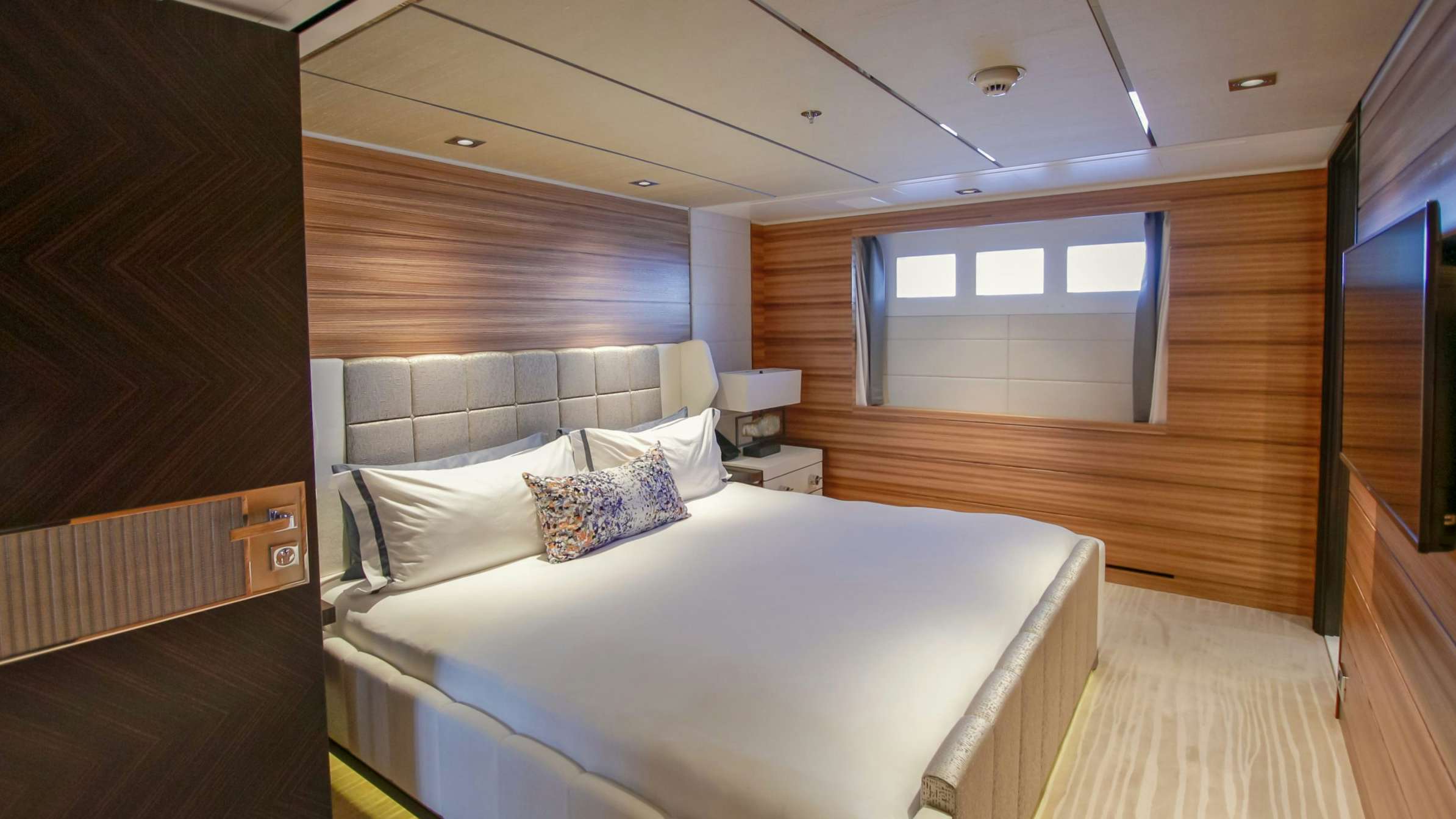 Accommodation is provided in a spacious and magnificent Owner's stateroom complete with a private balcony and fitted with separate bathroom and dressing room. Lower Guest accommodation offers two large VIP Cabins w/ King beds aft and then two Twin Convertible cabins up forward
