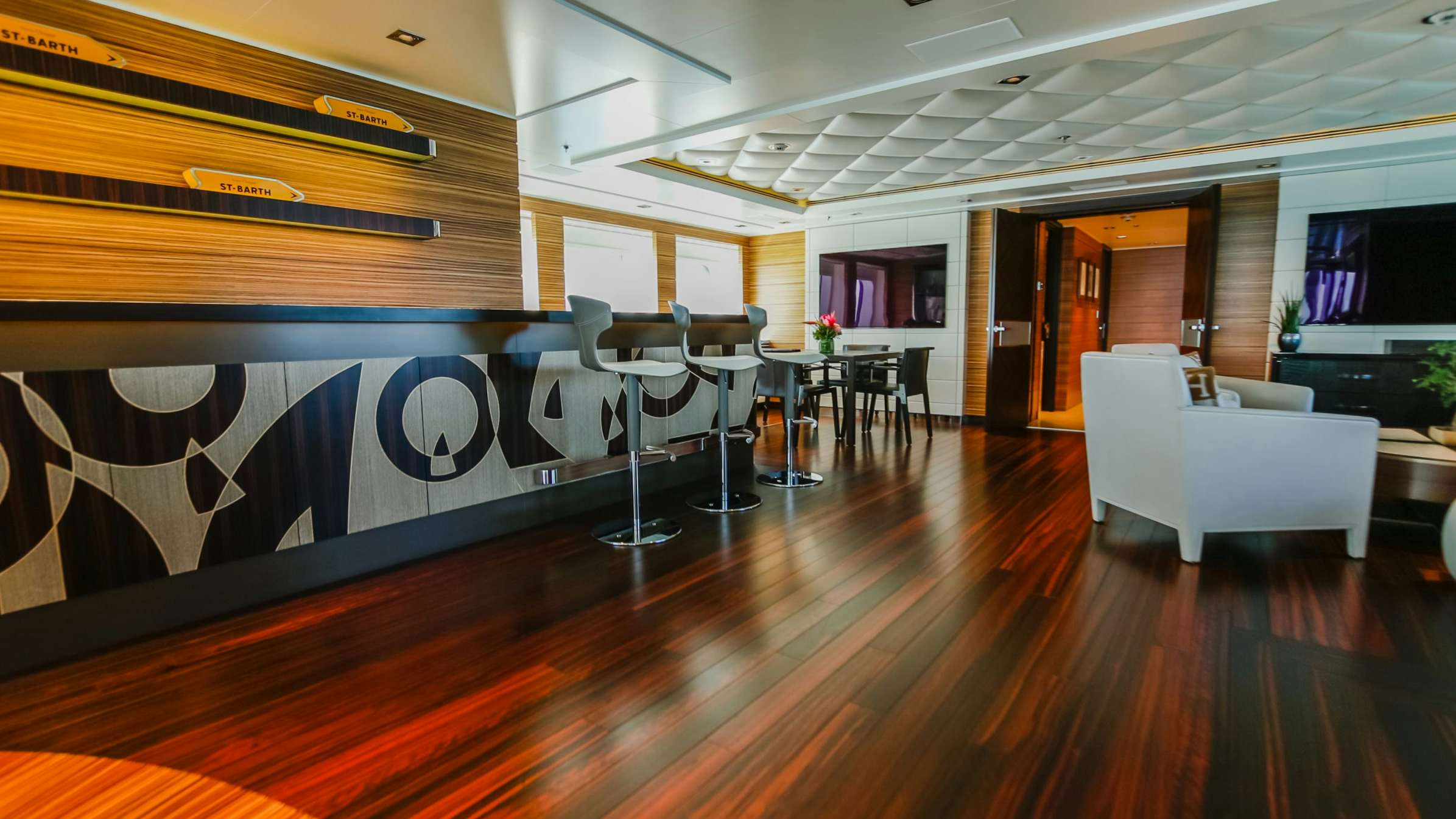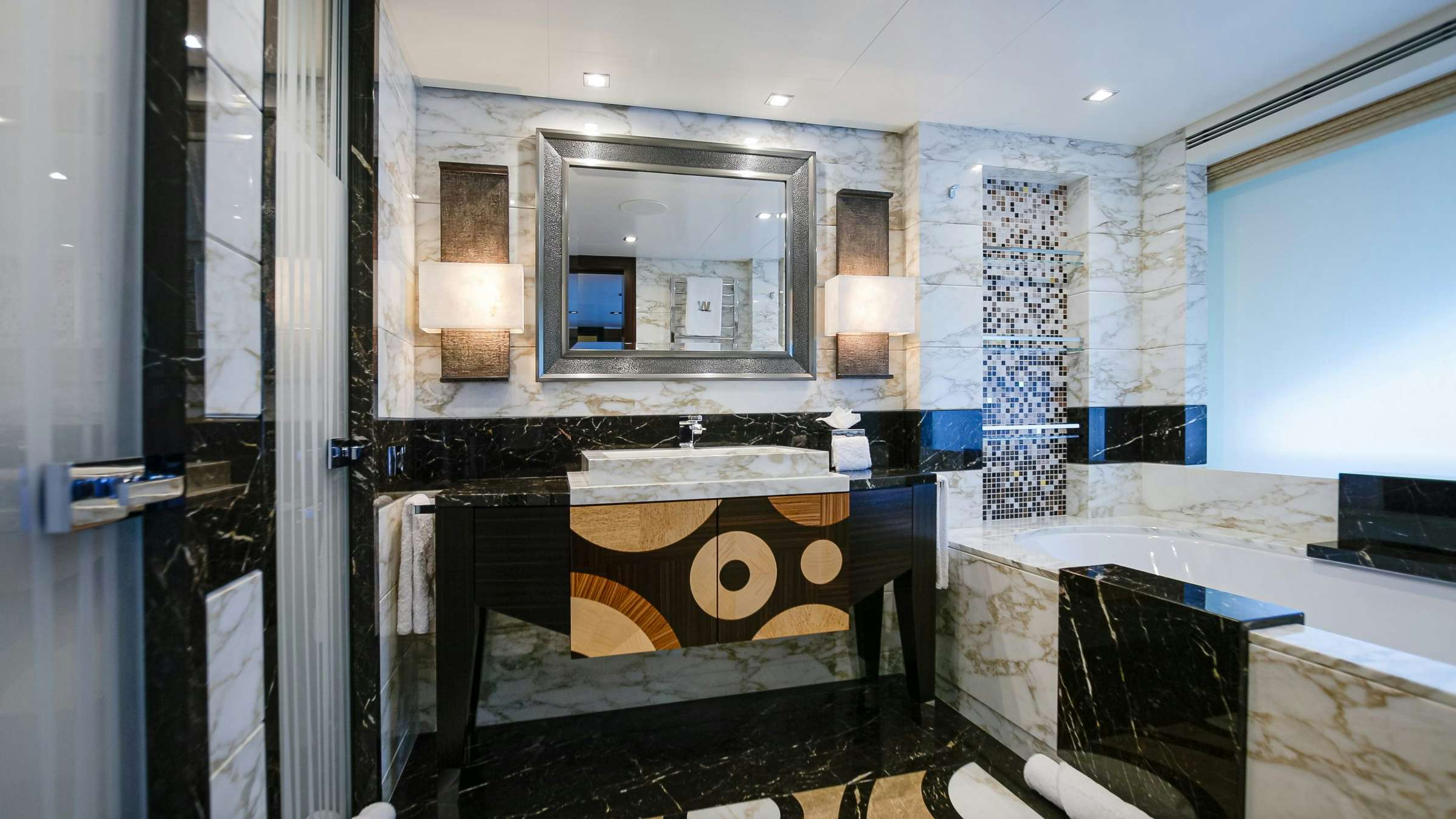 An additional sleeping option is located in the Bridge Deck Salon - a queen murphy bed is located on the port side, and the area boasts full en-suite facilities inc. shower. The yacht is managed by a professional crew of 13.. There is also a captain's cabin, laundry and storage rooms, all situated on the lower deck. Motor yacht W is fitted with a wide range of water toys.