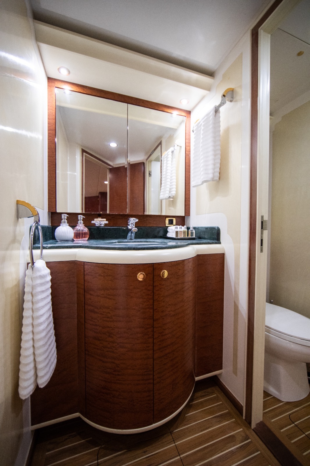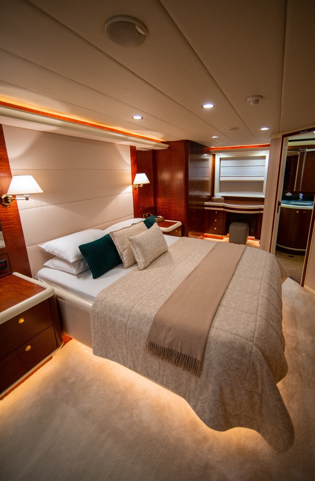 This outstanding vessel can accommodate 10 charter guests very comfortably in 5 luxury cabins. She also offers an extra cabin for a nanny on the lower deck. The full beam/width master cabin is located on the main deck. She also provides 2 VIP double cabins and 2 charter guest staterooms.