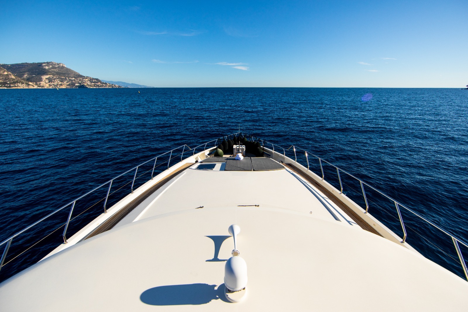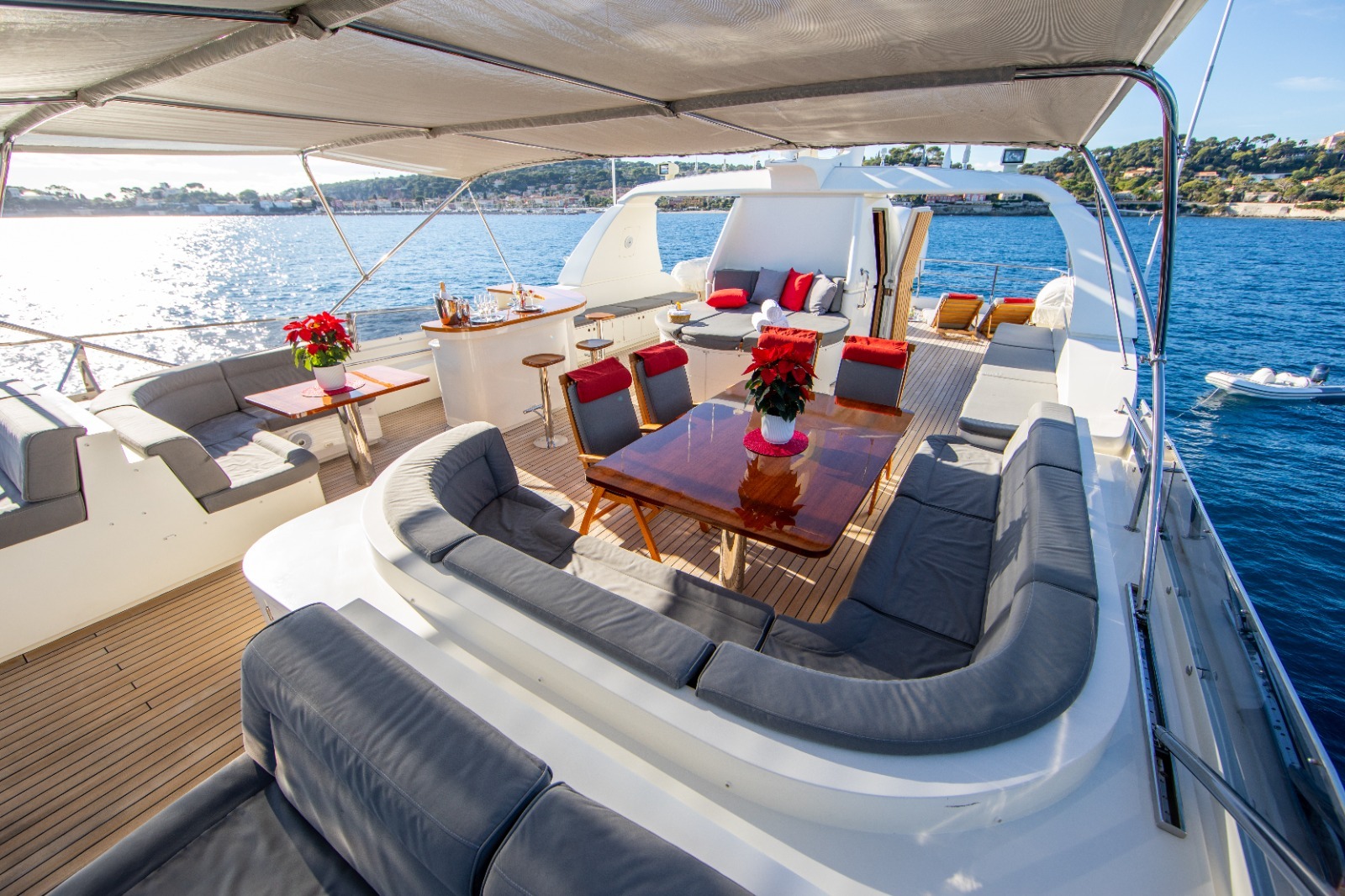 On deck motor yacht VIKING III is ideal for entertaining. The aft deck is easily accessed from the main salon’s sliding doors, offering a shaded alfresco dining option and full beam lounge seating. Guests wishing to take a dip into the azure blue waters of the Mediterranean will be pleased to find an extended swim platform on the transom.