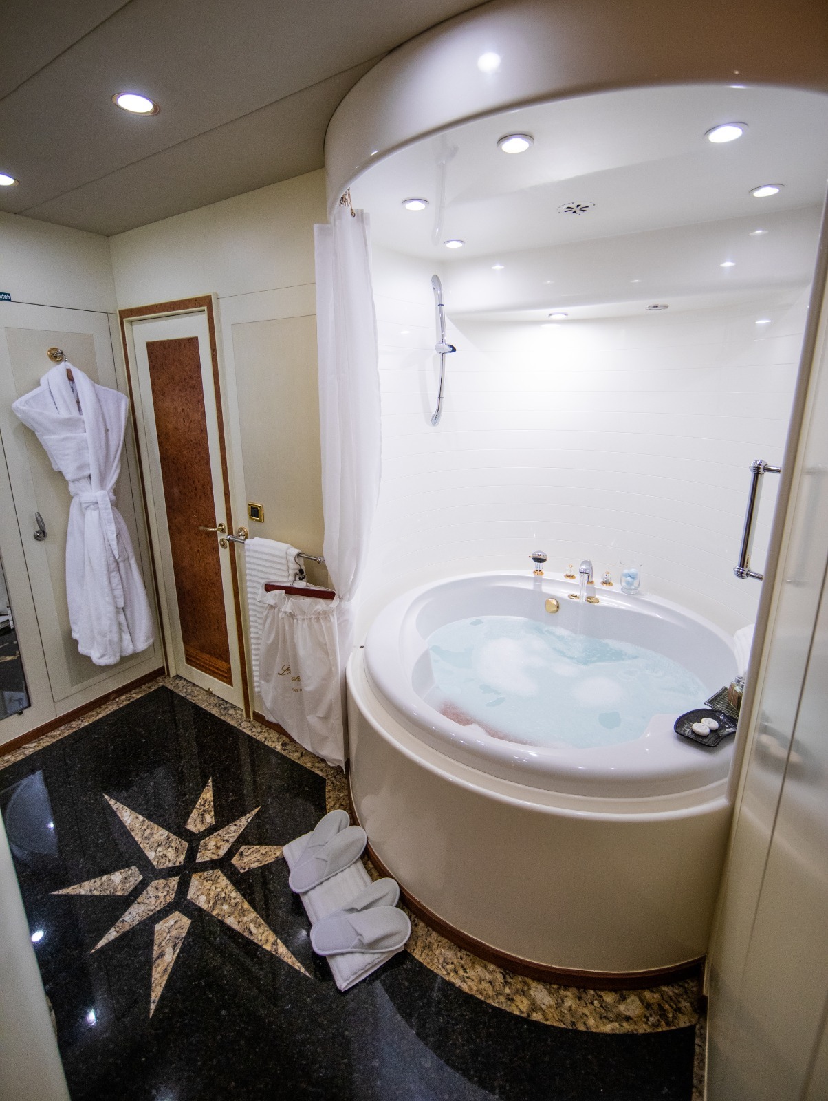 Forward of the salon and dining, is the galley, followed by a private entrance into the full beam master stateroom, complete with sofa, vanity and en-suite facilities with his and hers sink and hot tub.