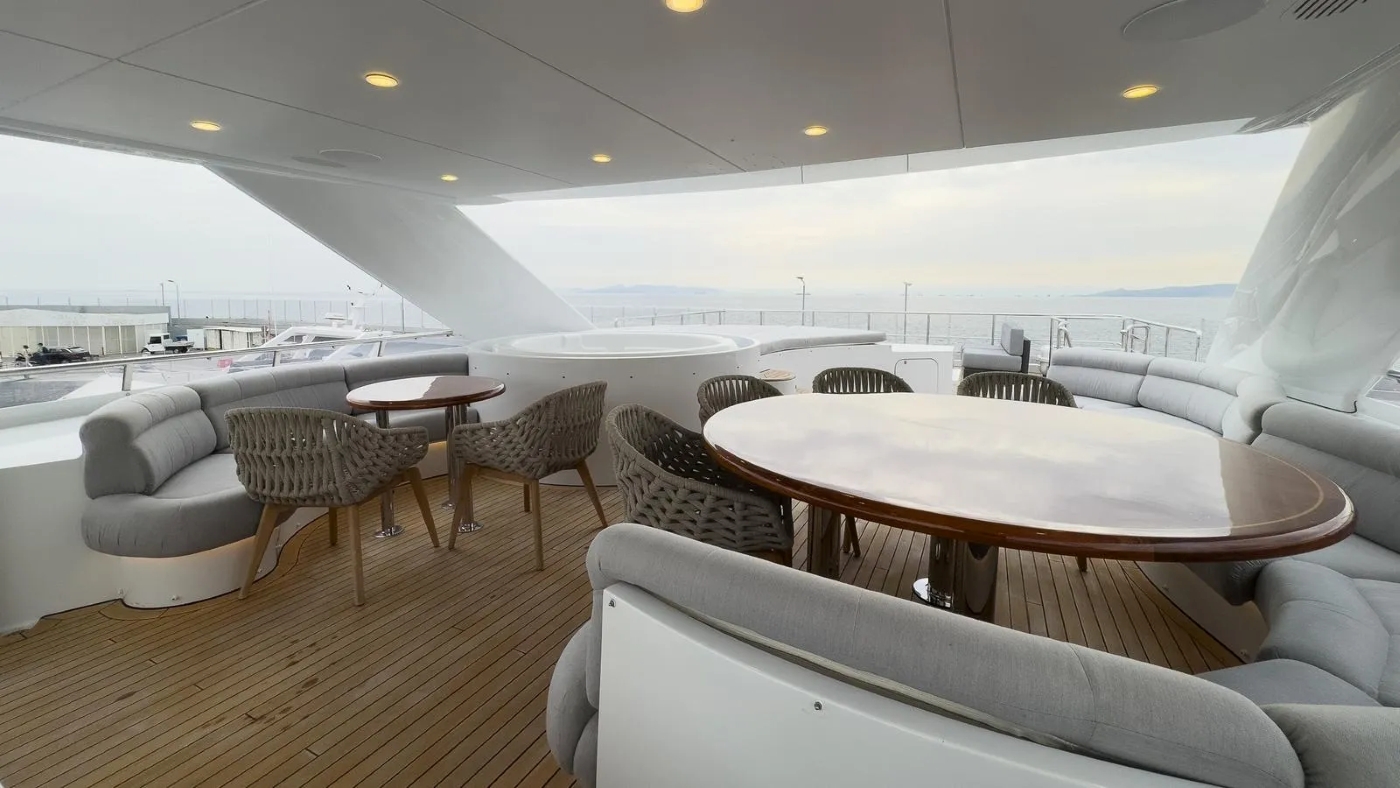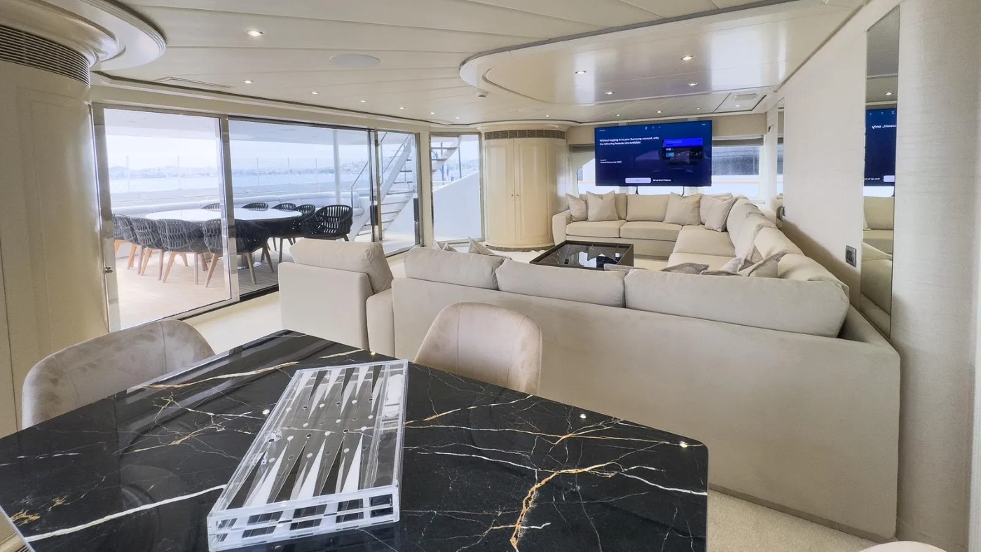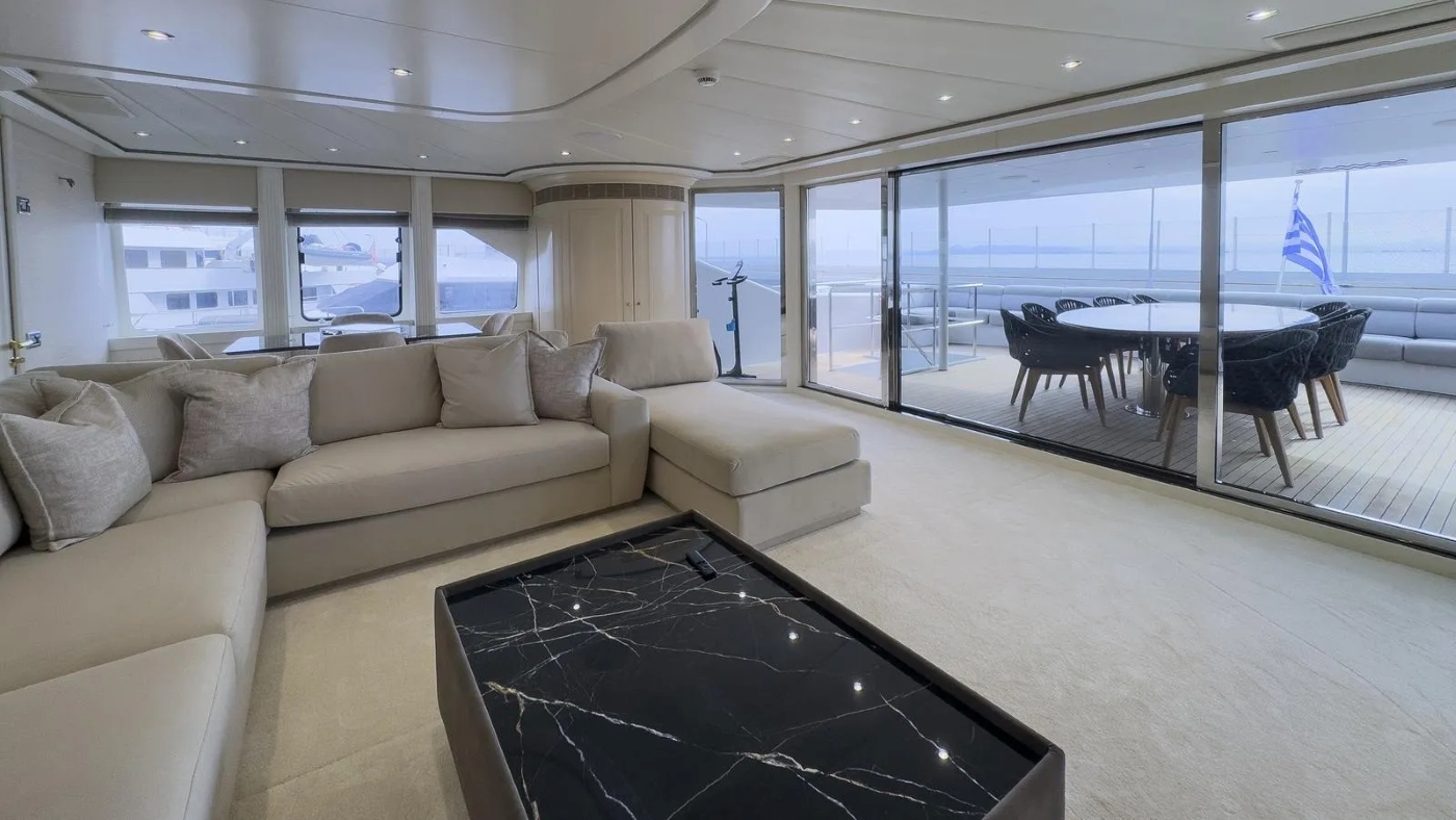 She has an unusual layout in that the aft deck is closed but can be opened by sliding doors. This is ideal for dinner parties (up to 16 guests).