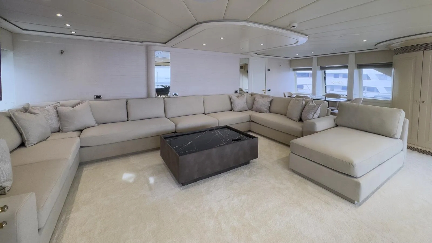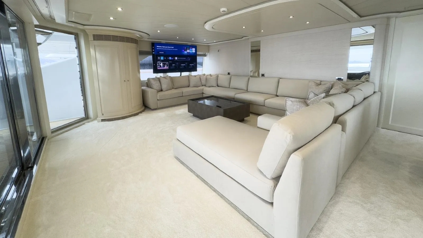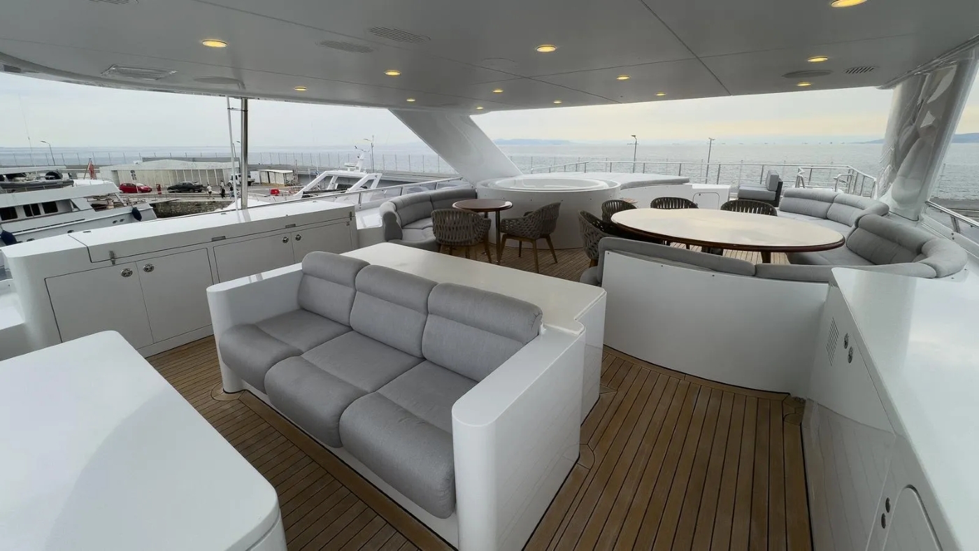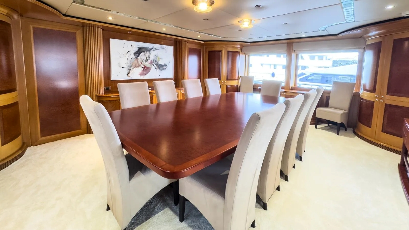 She has an unusual layout in that the aft deck is closed but can be opened by sliding doors. This is ideal for dinner parties (up to 16 guests).