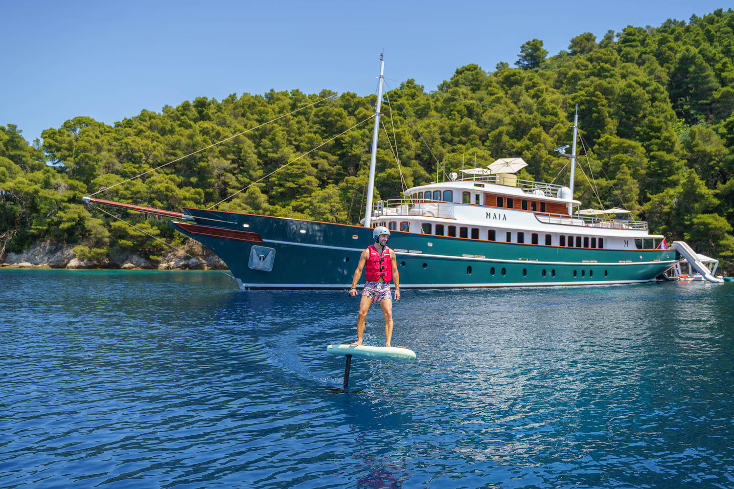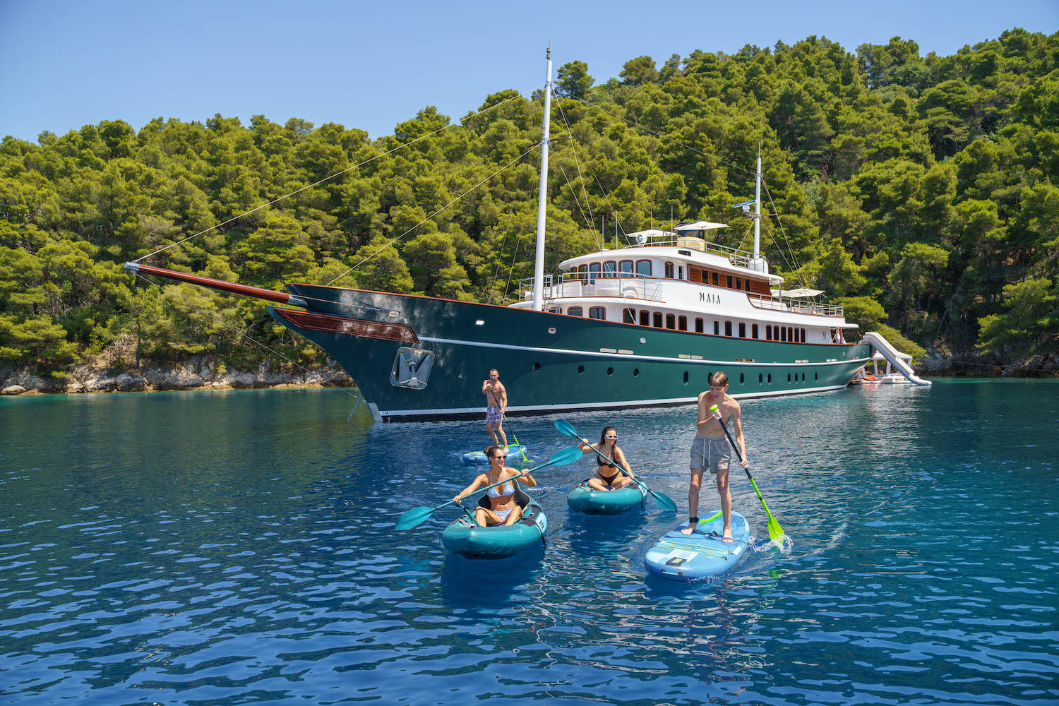 Luxury Classic yacht MAIA is equipped with a 6.5m RIS MARINE tender with 175HP for up to 12 passengers. Toys will include: 2 Seadoo Spark jetskis/waverunners (or 1 of each - TBC), 2 E-foils, including an Air Pro, 2 x seabobs, 2 kayaks, 2 paddleboards, Water skies for adults and children, Towables, Many inflatable platforms. The gym will be equipped with a Technogym. Treadmill, bike and a multi-purpose bench with weights.