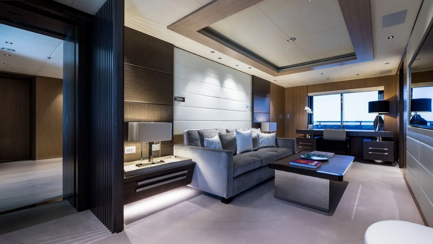The accommodation sleeps a maximum of 12 guests across 8 en-suite cabins, of which there is 1 Master suite, 4 spacious guest cabins and 1 twin cabin with an adjacent nanny suite. The Master suite on the upper deck is surrounded by glass for exceptional views and an abundance of natural light throughout the day. The two adjoining bathrooms have walk-in wardrobes while the bedroom also contains a generous day area with sofa and television, with connections to the outdoor terrace. The main deck hosts a twin cabin with adjoining nanny cabin, and four sizeable guest cabins are placed on the lower deck. The crew of 13 is accommodated over 9 cabins, placed on the lower deck while the Captain's cabin is located on the bridge deck.