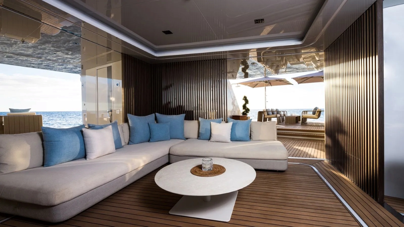 The lower deck provides a large swim platform connecting onto a spacious beach club where guests can unwind beside the water. The main deck is easily accessed by an aft stairway and the area offers a shaded relaxation area for casual lounging and alfresco dining.