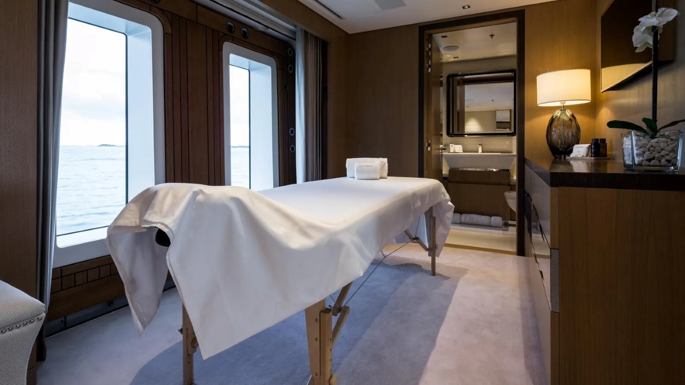 On the main deck, the main salon is placed to the aft and combines a lounge with a formal dining area for uninterrupted flow between the two areas. The main deck also hosts a children's playroom and a twin cabin with a nanny room attached.