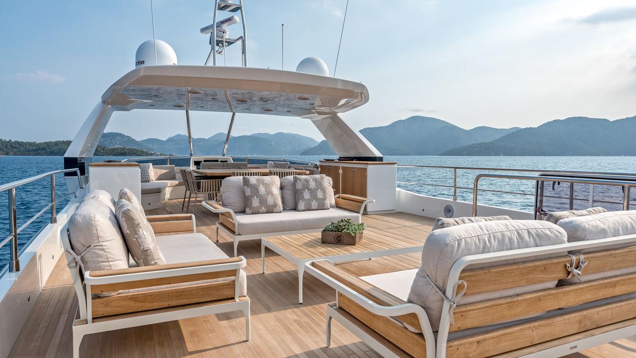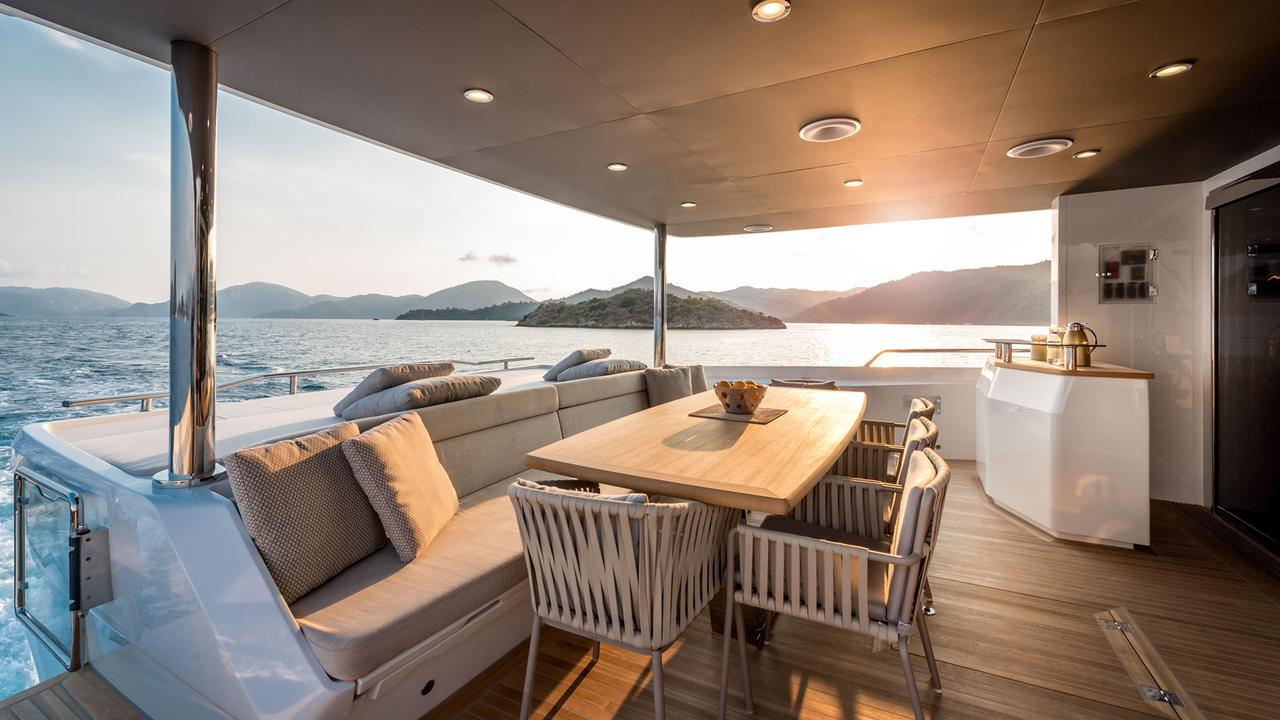 The flybridge has been fitted with an aft lounge with three plush sofas and a coffee table. The space beneath the hardtop contains a bar and a dining table for additional outdoor comfort and socialising. The stern is used to stored a tender.