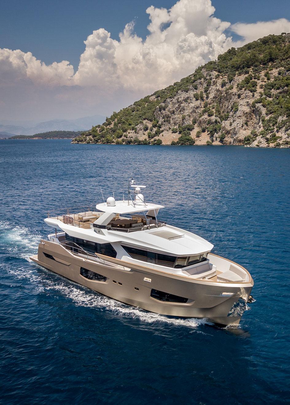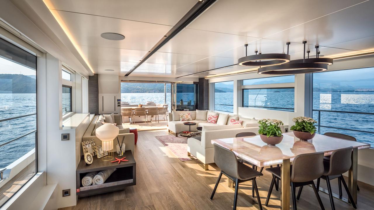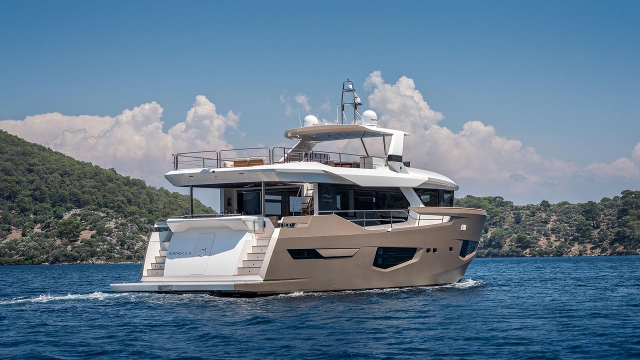 NOTABLE FEATURES OF MINELLA: ~ vast exterior guest areas ~ huge windows in the salon ~ Sound reduction technology for quiet engines ~ Range of 3,000 nautical miles ~ Air conditioning ~ Wi-fi