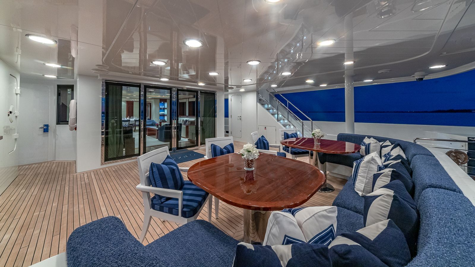 The yacht boasts impressive outdoor deck spaces, a well-balanced mix of sheltered and open venues, expansive settings and secluded corners, which are suitable for relaxation, as well as other social occasions.