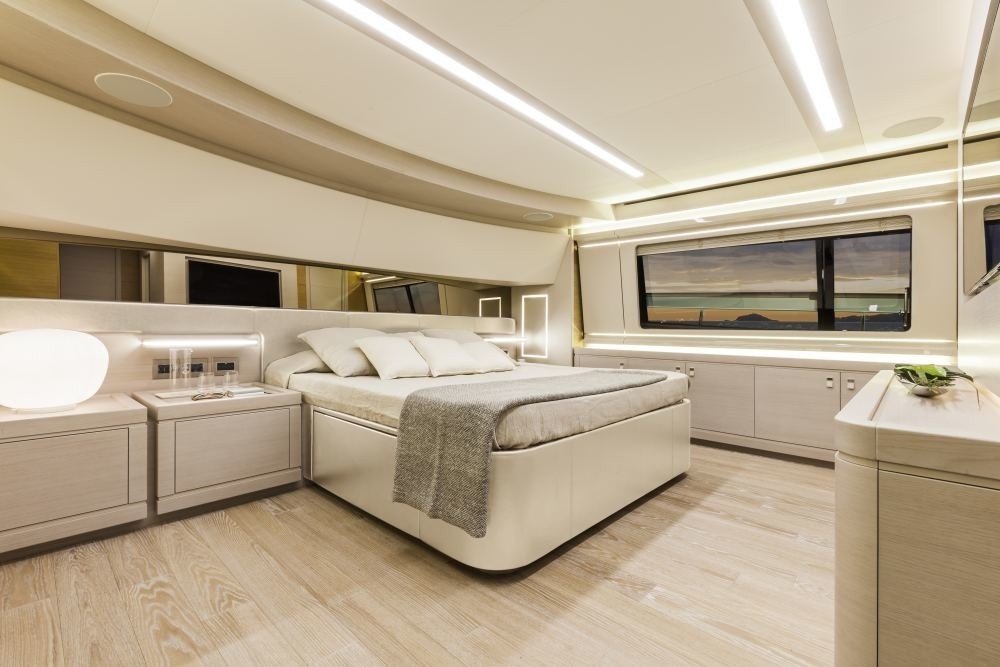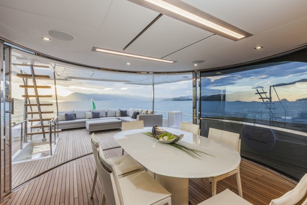 Among special features of this superb vessel belongs the Dual Mode Transom - a revolutionary electro-hydraulic system, which allows to open the hatch both upwards and downwards, thanks to one single pair of pistons, combining together three different functions and maximising the use of this area. In addition, there is the system, called ‘VOTIS’ (Videoworks One Touch Infotainment System), which allows to control through an iPad the whole entertainment system installed in the main deck salon, thereby replacing all the remote controls of the various onboard appliances with one single device.