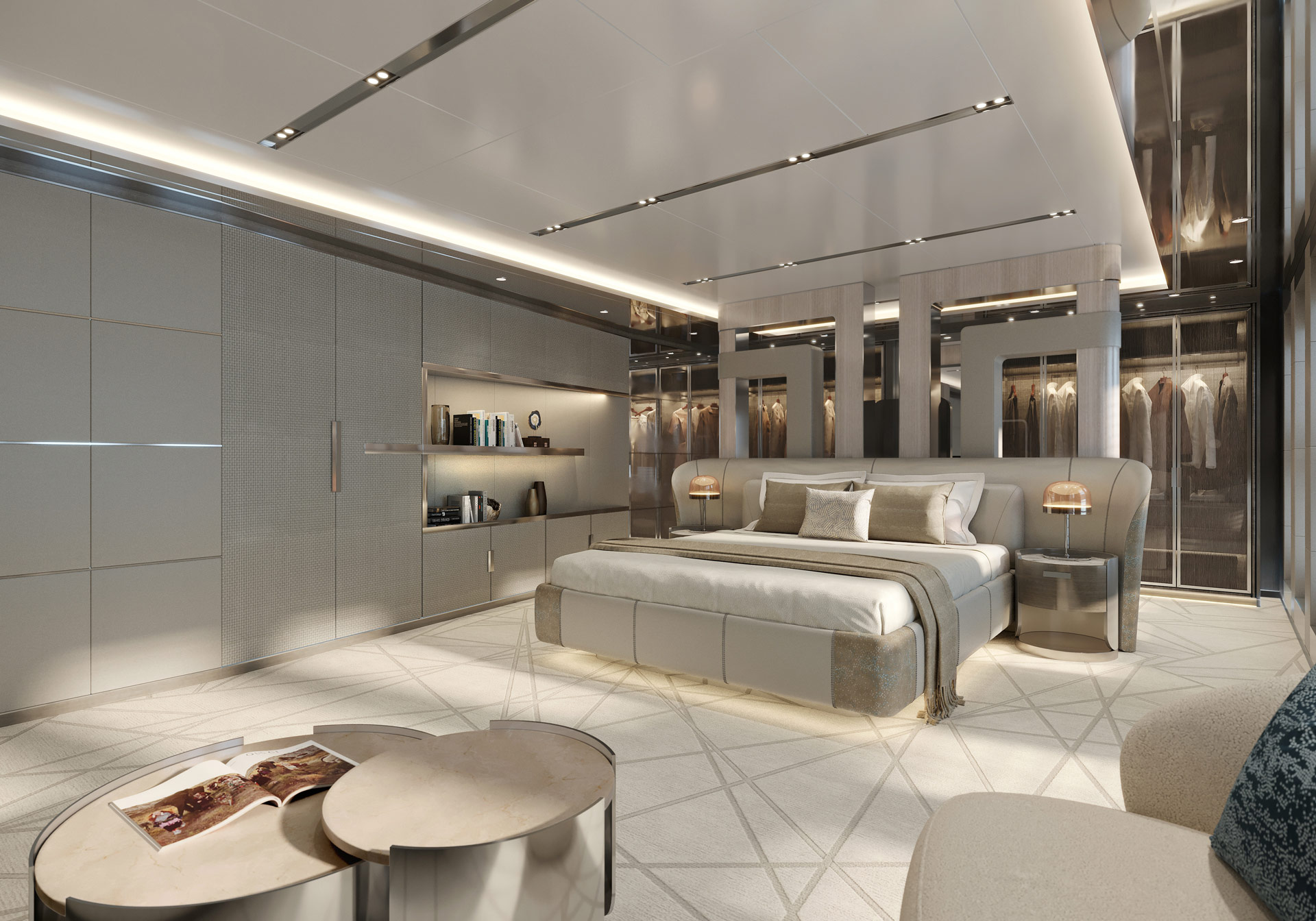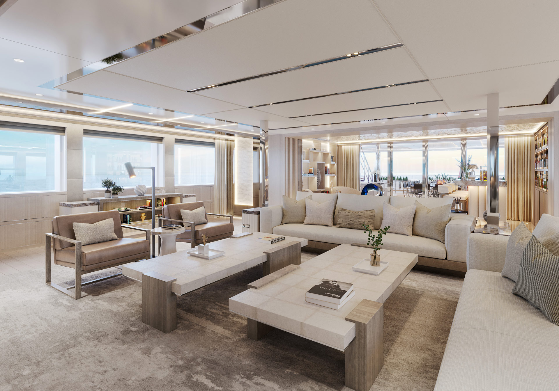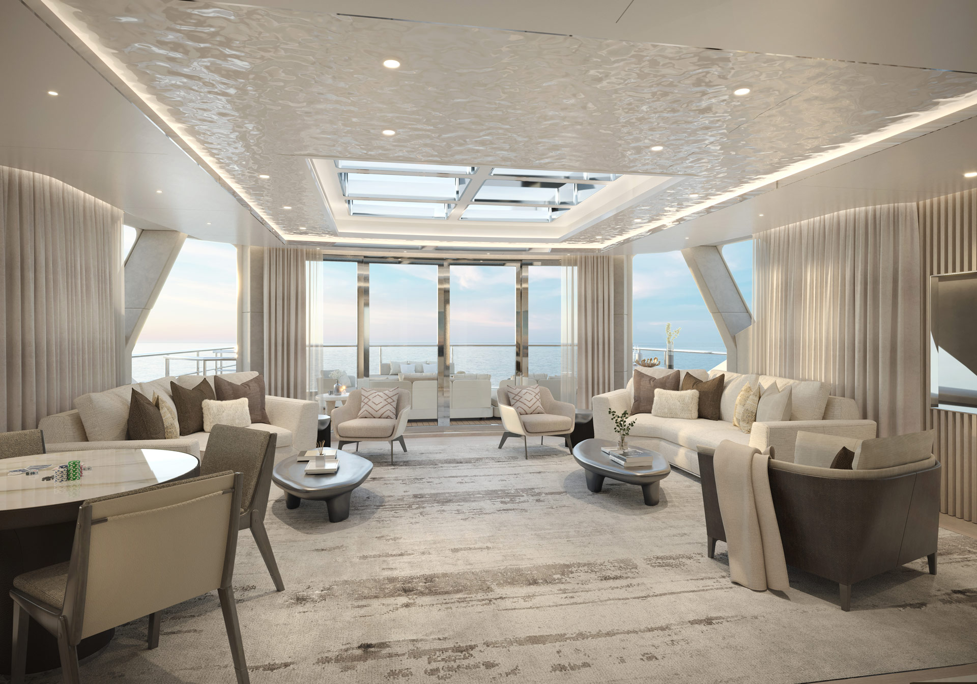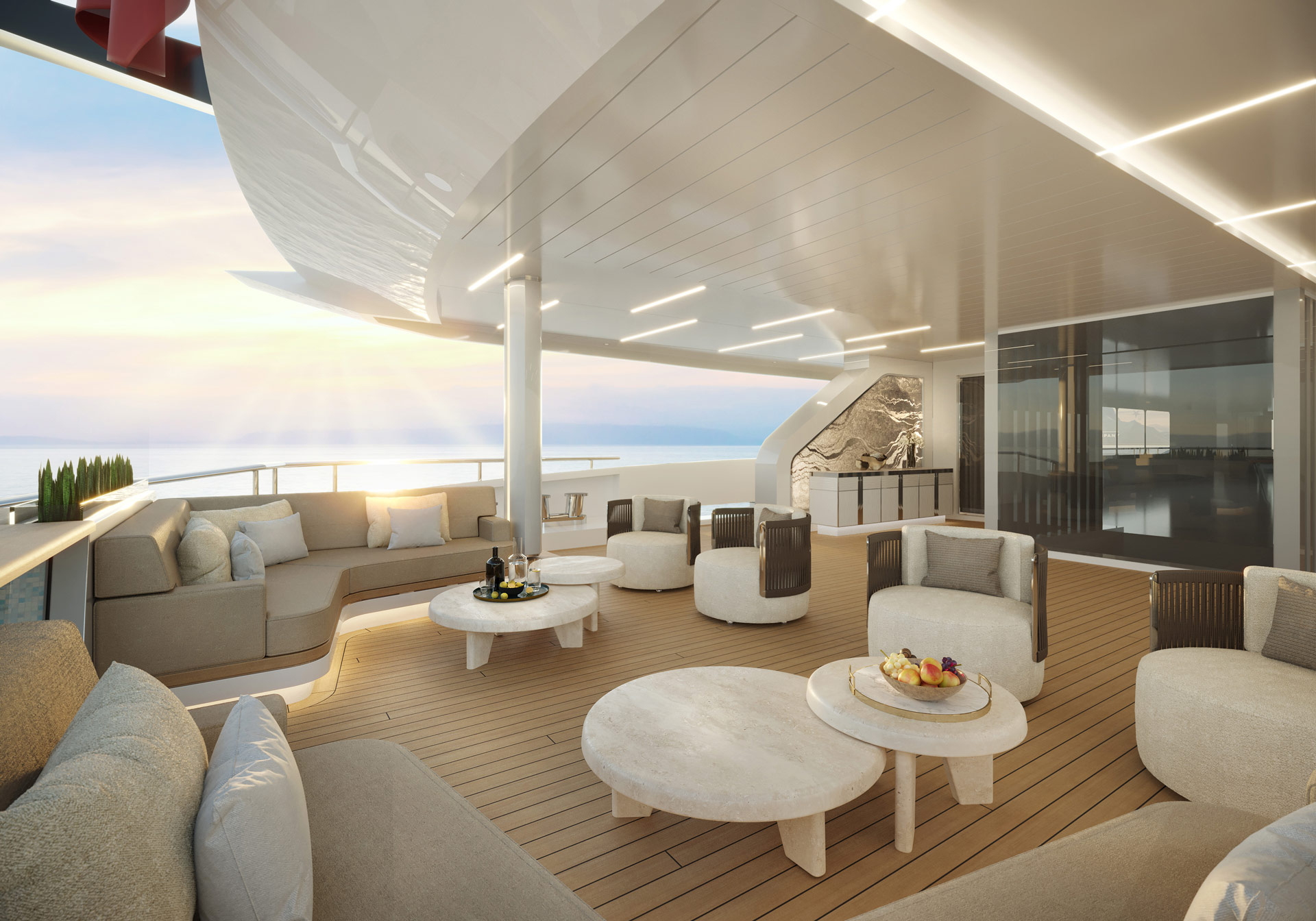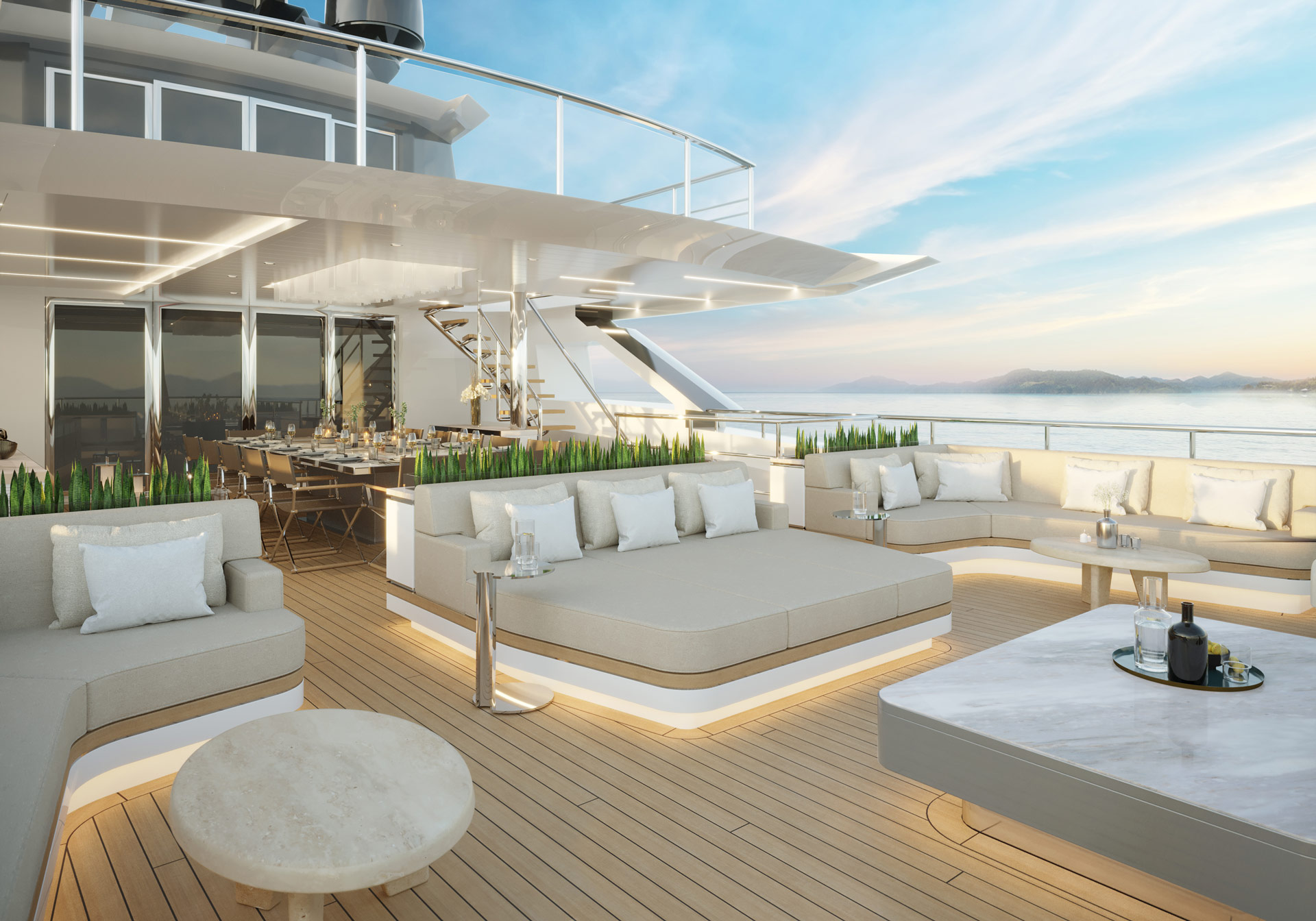 The upper deck aft has an aft-facing L-shaped sofa accompanied by a coffee table in each corner, and in the centre there is a loveseat forward and aft of a drinks table. The upper deck forward, meanwhile, has a curved sofa placed in the shade of the bridge deck overhang, and a raised table and additional chairs make a comfortable setting for alfresco dining in front of the Master suite. A large sofa/sunbed is placed to port and starboard farther forward, and the bow sections open up to reveal the tender garage within.