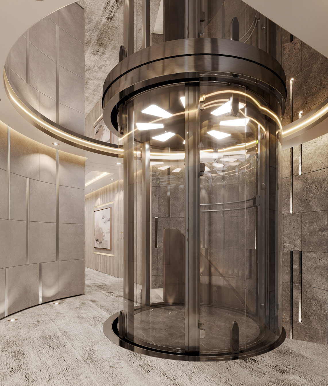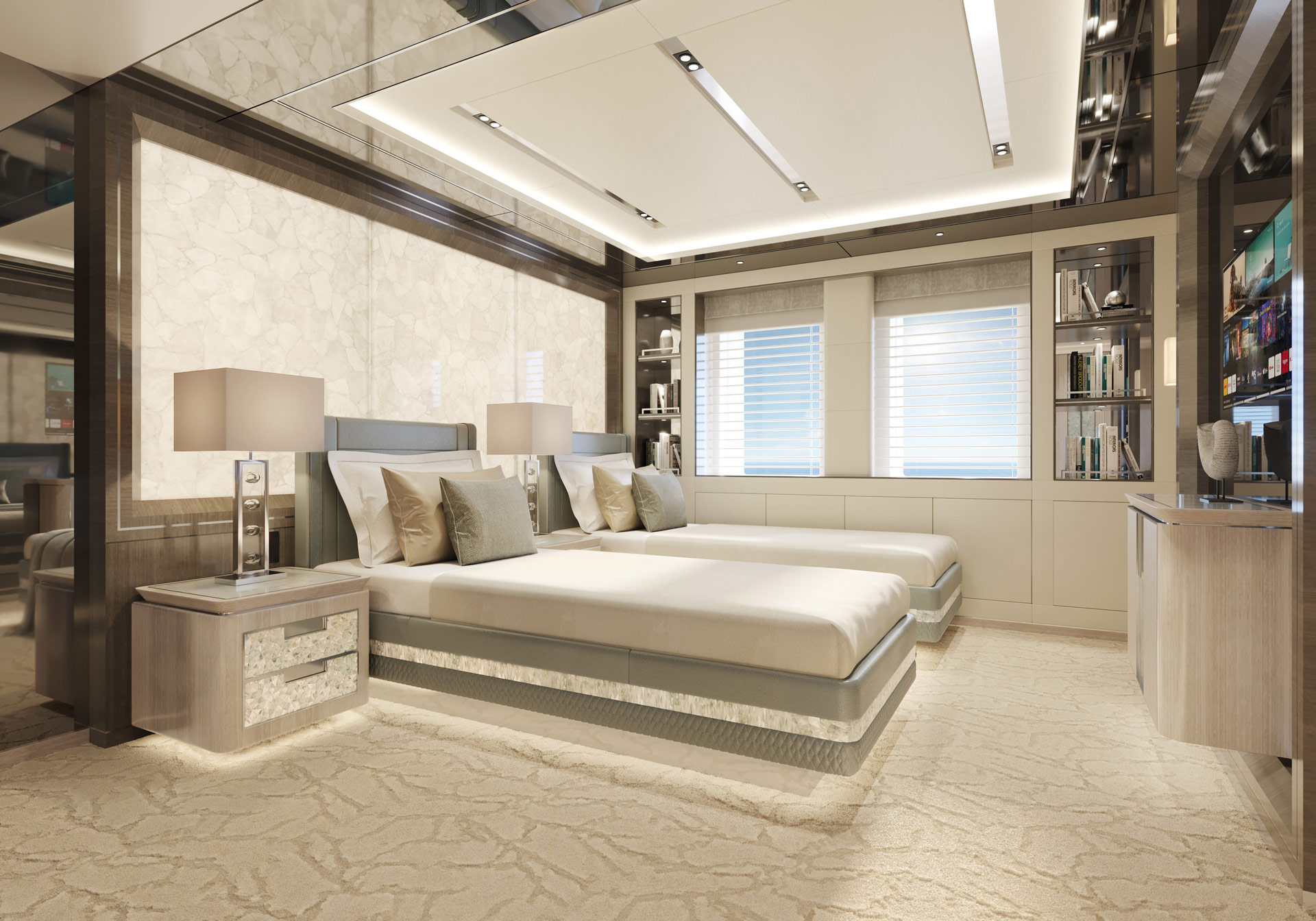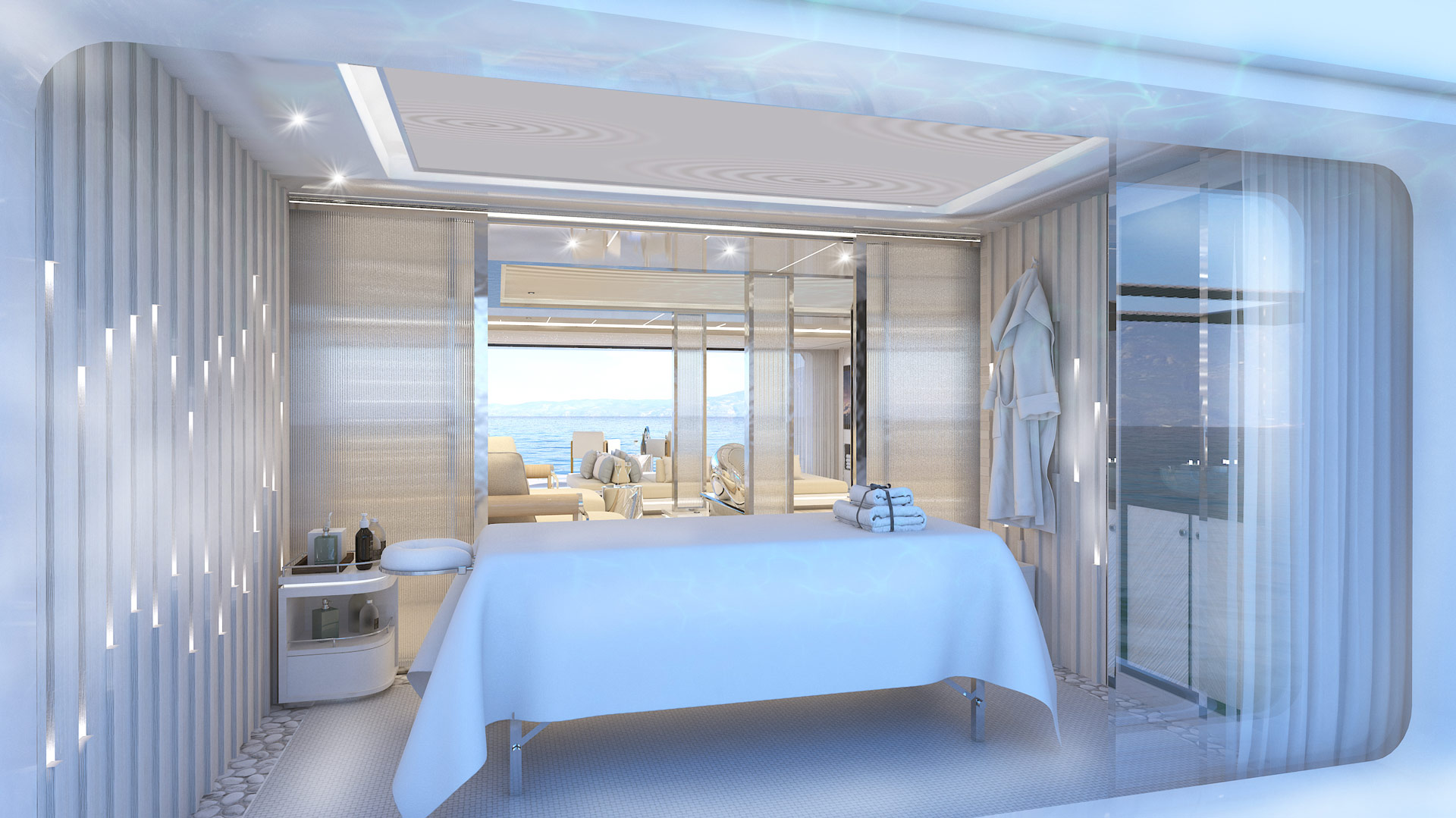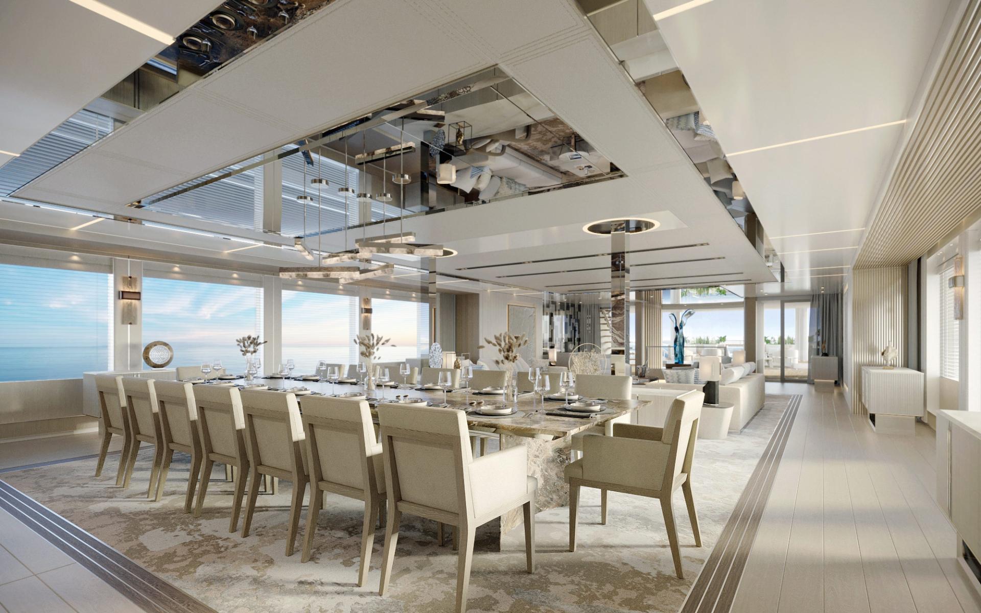 The lower deck hosts the guest and crew accommodation, with a spacious beach club in the stern containing a spa centre and gym, and providing a lounge perfect for social gatherings close to the water. A glass lift (elevator) provides access to all decks.