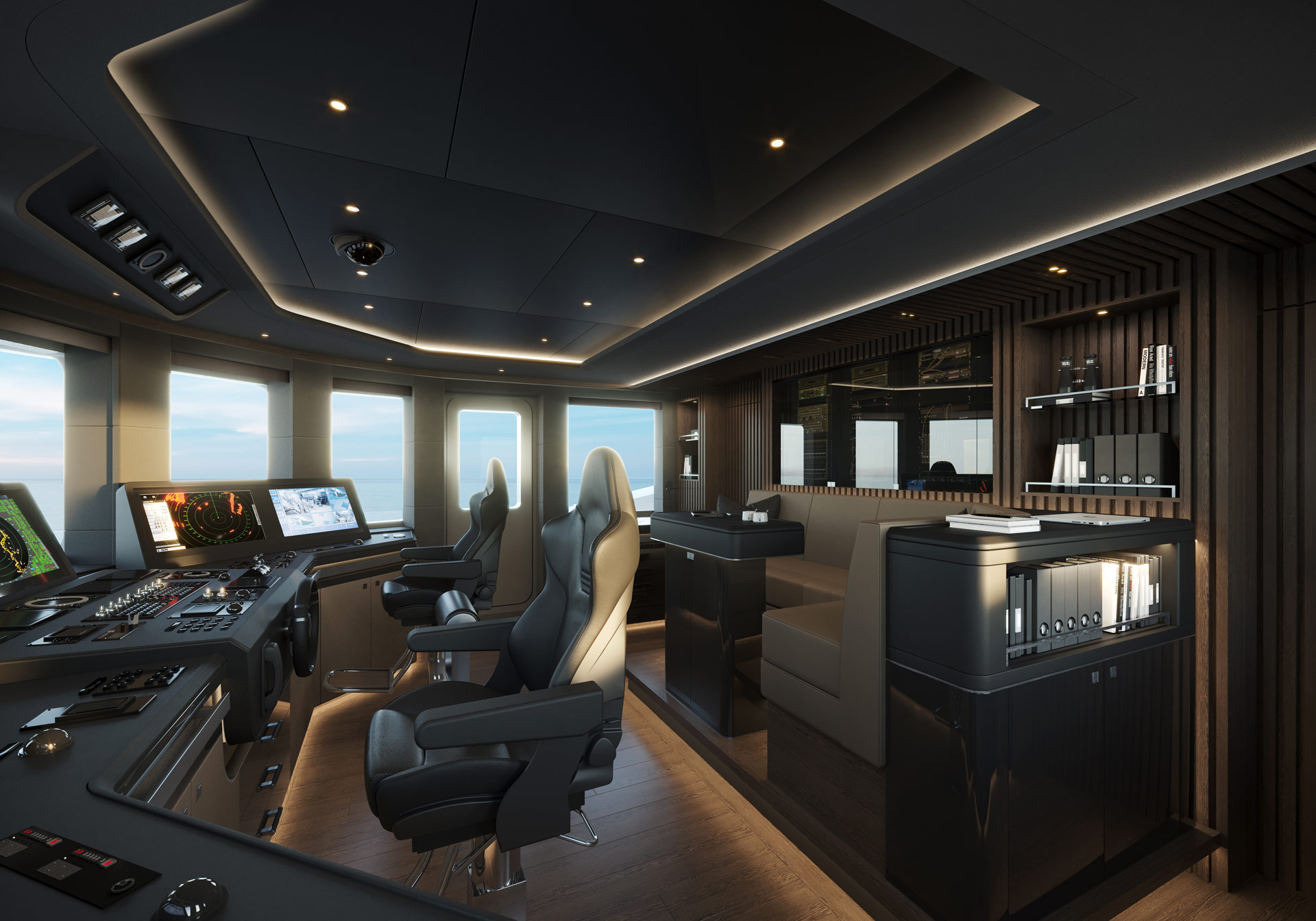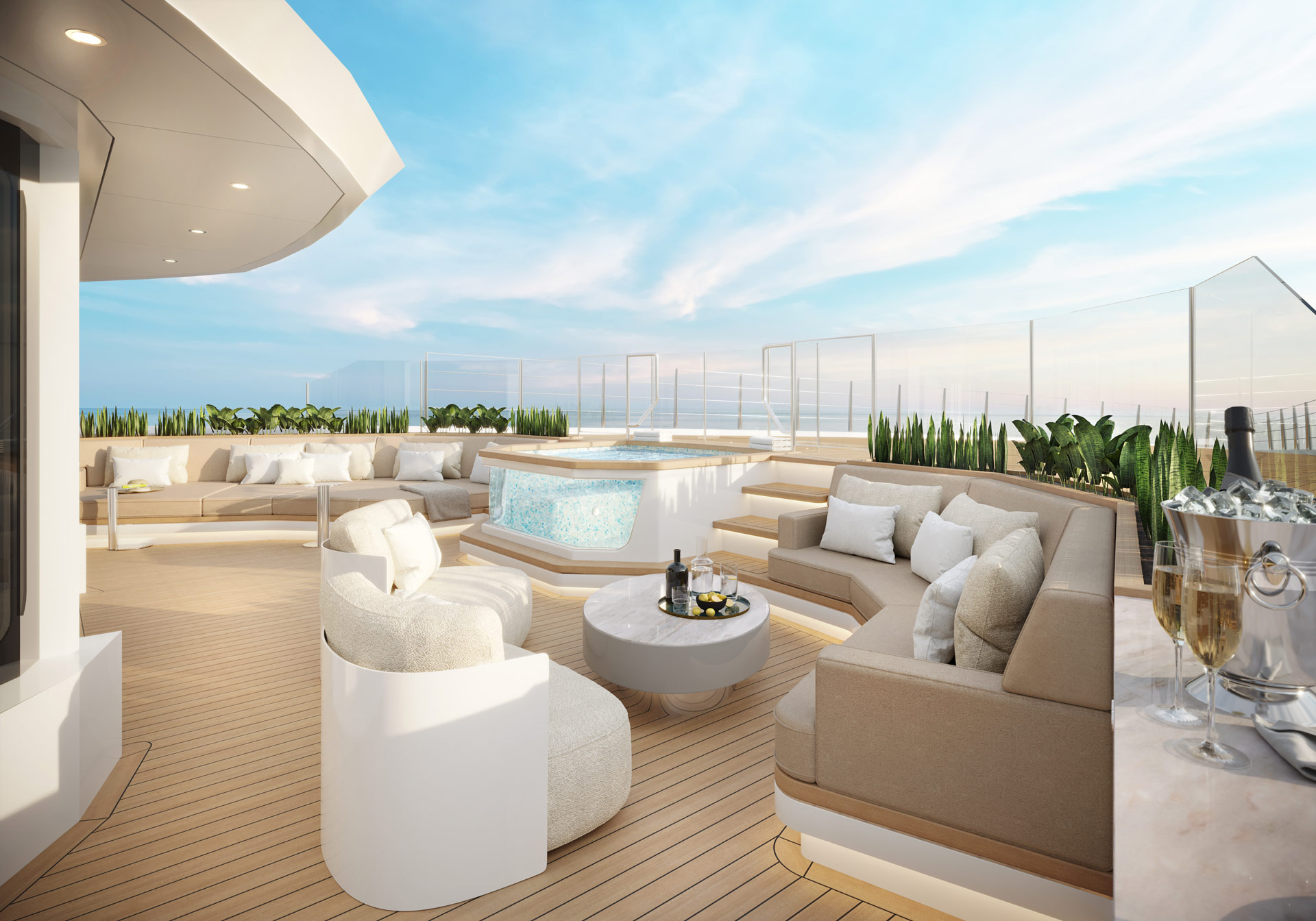 Up on the bridge deck, the central section contains the interior helm station while behind there are sun loungers, a drinks table and four chairs, and forward a sunbed to starboard, a curved sofa and drinks table to port and a Jacuzzi with commanding views of the surroundings.