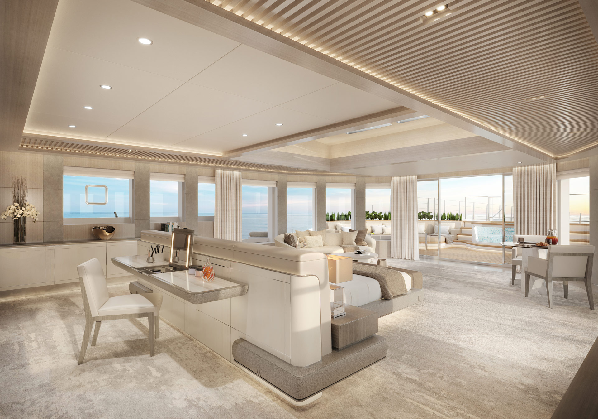 A large swim platform is connected to the main deck aft by two large stairways, and here a glass-sided swimming pool is placed in the centre with sunbeds placed on both sides. A C-shaped sofa is placed under the shade of the upper deck overhang with a table and chairs for casual outdoor relaxation with hobbies or for meals.