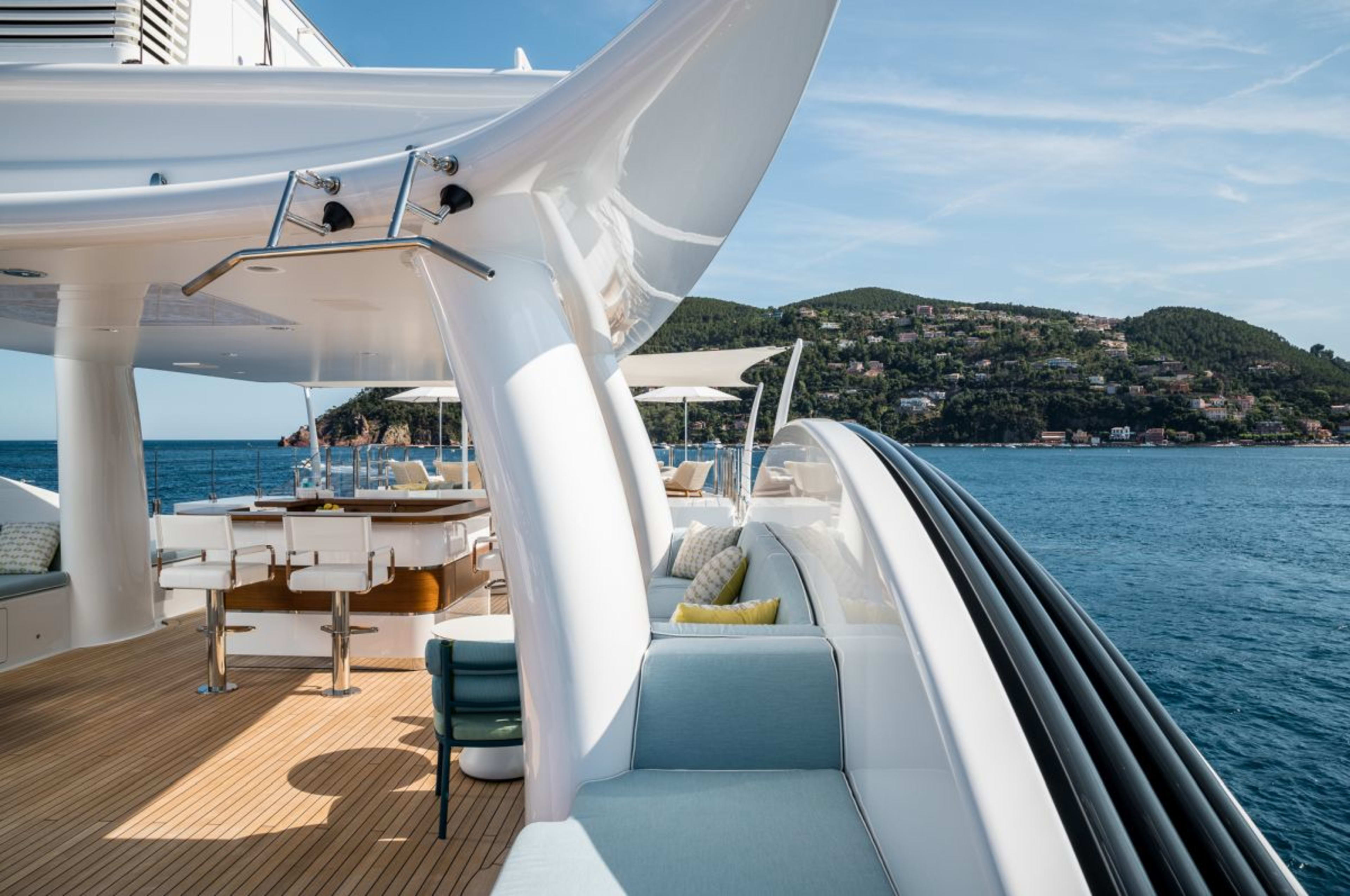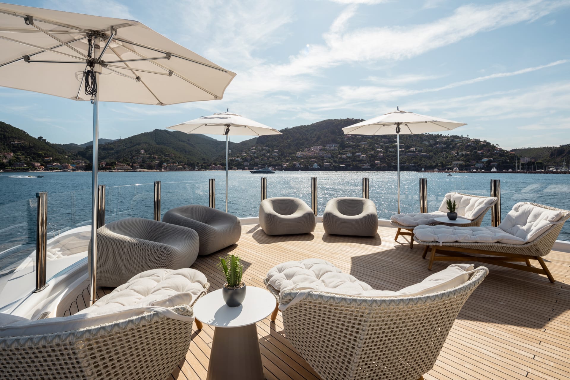 Across her three exterior deck levels luxury yacht NOMAD offers exceptional entertainment and relaxation space. The full-length sun deck is zoned for sunbathing, dining and has a full sit up bar and elegant jacuzzi. Umbrellas can be opened to create shade over the sun beds and the bar is covered by the hard roof making it flexible all day and all year round. The bridge deck is dedicated to dining with a huge table setting and sofas for pre or post dinner drinks. Entirely covered by the sun deck overhang the space is shaded by day and private at night. Lounge space on the main deck aft leads down to the water’s edge swim platform which can be extended with the addition of an inflatable platform which can create a swimming pool or dock the tender and toys – of which there is a fabulous choice.