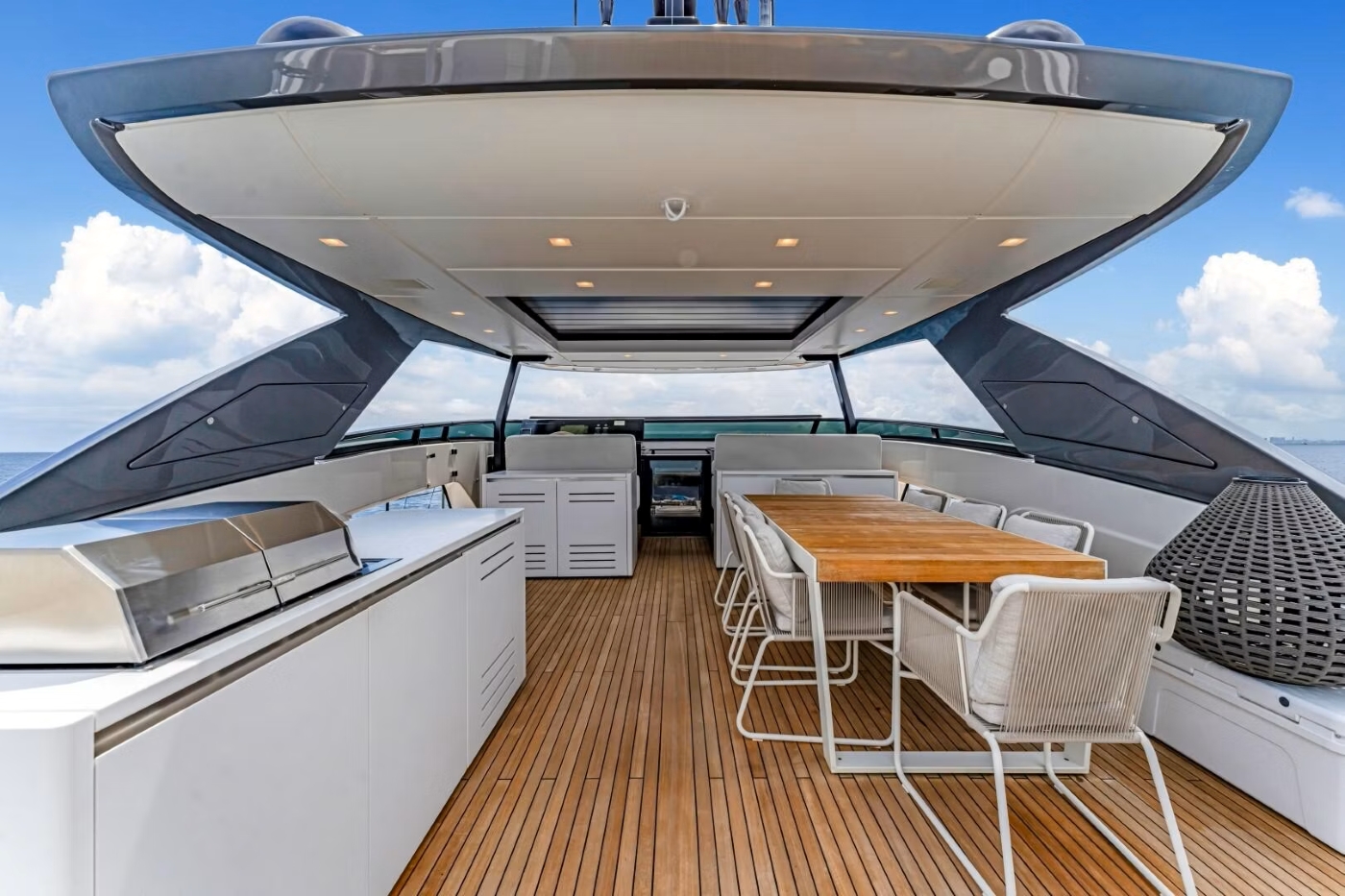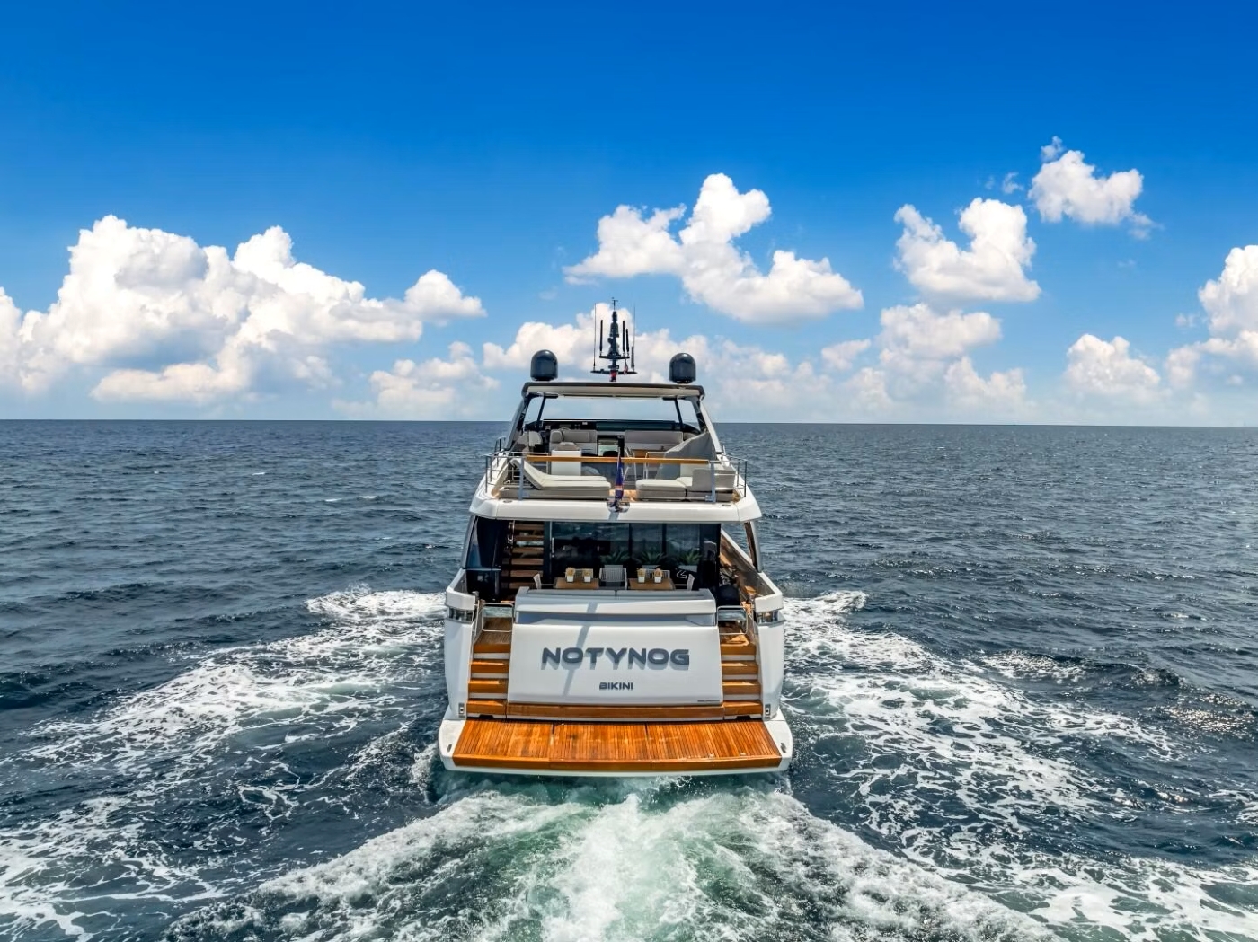 NOTYNOG’s exterior deck areas are thoughtfully arranged to offer both social and private experiences. Her aft deck features a comfortable lounge with direct access via external stairs to the expansive flybridge above. This elevated space includes forward sun pads, a shaded seating and dining area, and open space aft for lounging or enjoying cocktails at sunset.