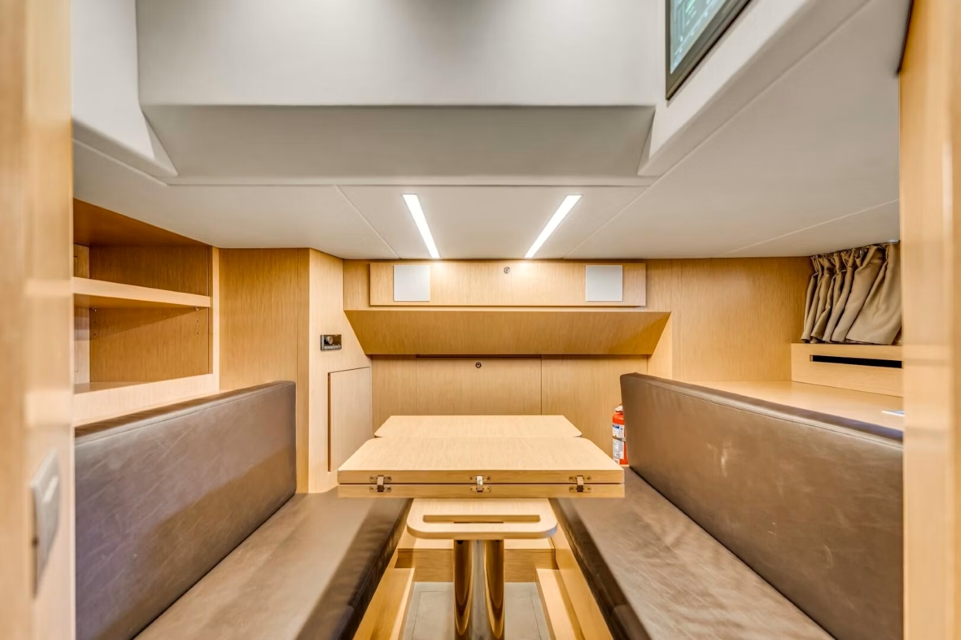 The main salon on board NOTYNOG is a luminous and welcoming space, framed by large windows that offer sweeping views and abundant natural light. It combines the dining and lounge areas into a cohesive, contemporary living space, ideal for entertaining or relaxed family meals.