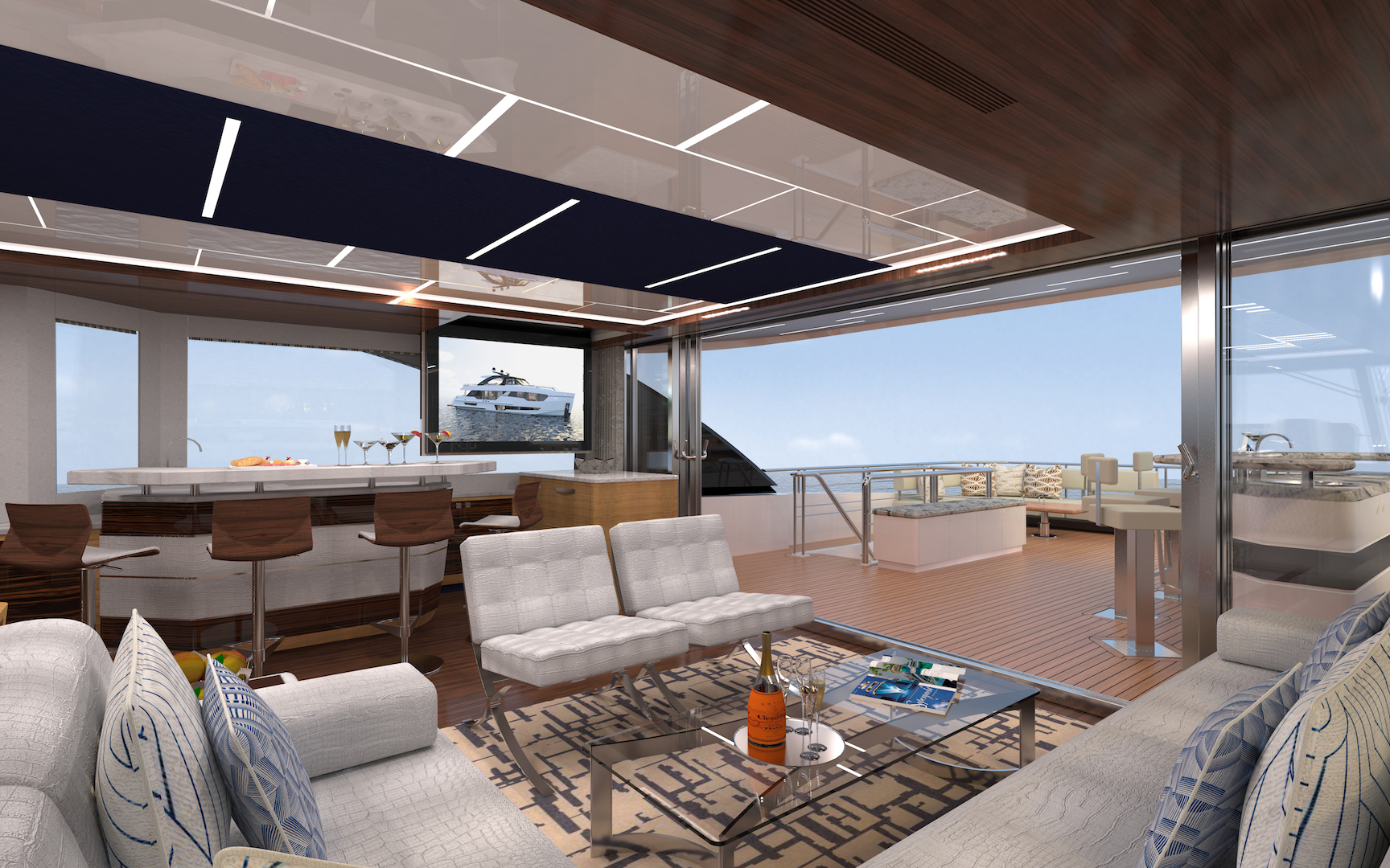 On the upper deck, the skylounge hosts an L-shaped sofa, coffee table with chairs and a bar. The sliding glass doors provide closer to the sea experience and a fantastic opportunity to enjoy the light sea breeze. There is a wet bar on the aft deck, as well as corner sofas and drinks tables for a get together with friends and family or holding a special event.