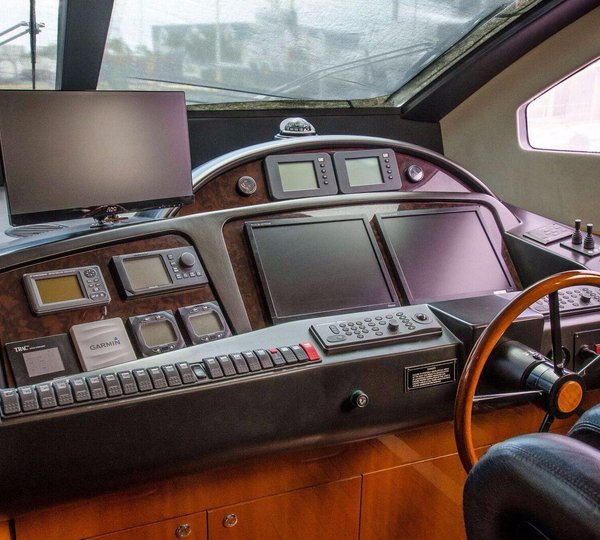 Motor yacht IT'S NOON SOMEWHERE offers up to 6 yacht charter guests luxurious accommodation in 3 spacious cabins. Her main master stateroom is with full beam and located amidships with a king sized bed, full ensuite bathroom, including a Spa Pool hot tub, shower stall, bidet, single sink and make-up vanity. Perfect Vision’s master also provides a walk-in closet as well as full electrical entertainment system with Satellite TV (Cable 42” flat screen) & CD & DVD & surround sound. The yachts VIP Stateroom has a queen sized bed, ensuite bathroom and shower, 42 inch Flat screen Sat TV with Cable VCR & DVD. The guest stateroom offers 3 single beds, a en suite bathroom and shower, a 15” Flat screen Sat & Cable TV with VCR & DVD.