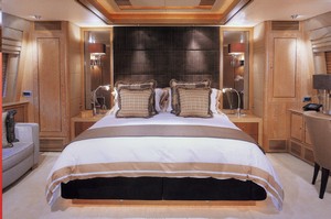 Luxury motor yacht Philosophy has superior accommodation for up to 10 charter guests in 5 individual cabins. The yacht’s main master suite located forward on the yacht’s main deck and includes a full entertainment centre with Sat TV. The master suite also boasts a ‘his & hers’ bathroom ensuite (with bath & shower) with dressing vanity area and an adjoining but sofa and separate study. Philosophy also provides a further four guest cabins on her lower deck. Two of the cabins are VIP with queen sized beds, vanity and sofas and two of the cabins are twin bedded. All of the cabins have their own ensuite bathroom facilities.