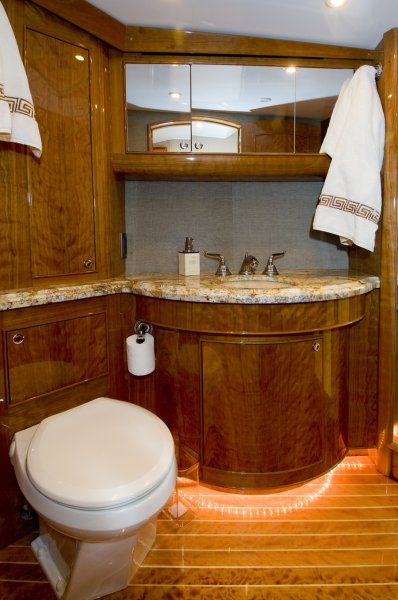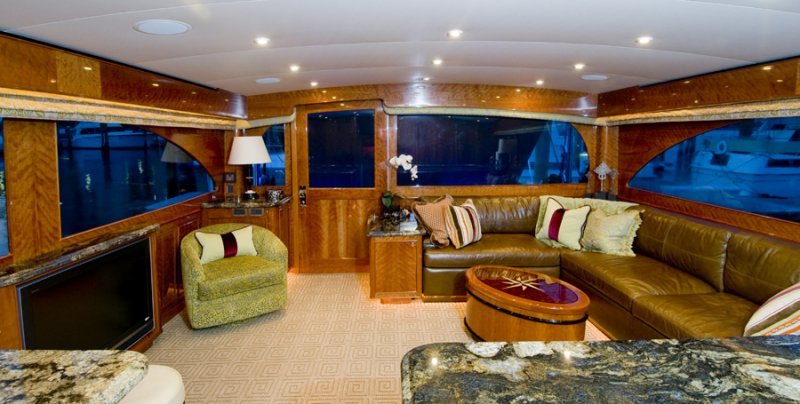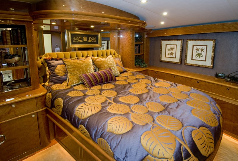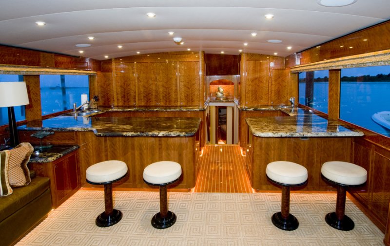 The interiors of the JB70 yacht Ravaganza, comfortably sleeping 8 guests, boast a light, yet luxurious look, thanks to the use of high gloss cherry, granite counters and a considerable amount of inlay work throughout.