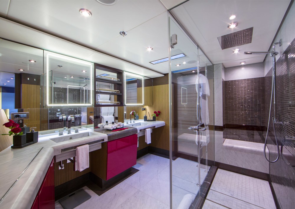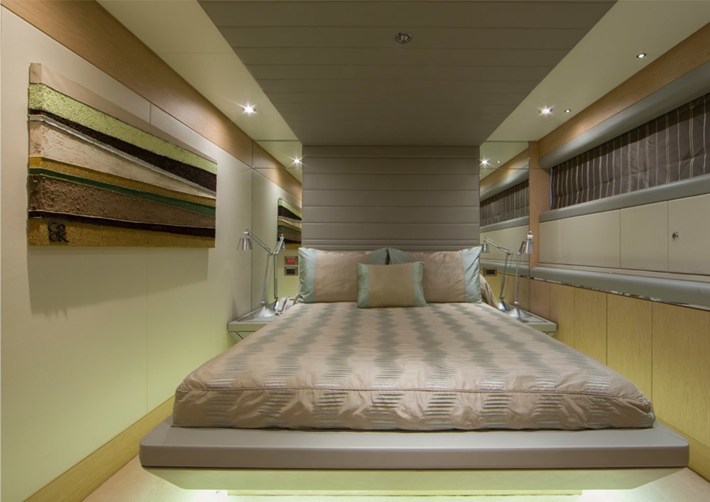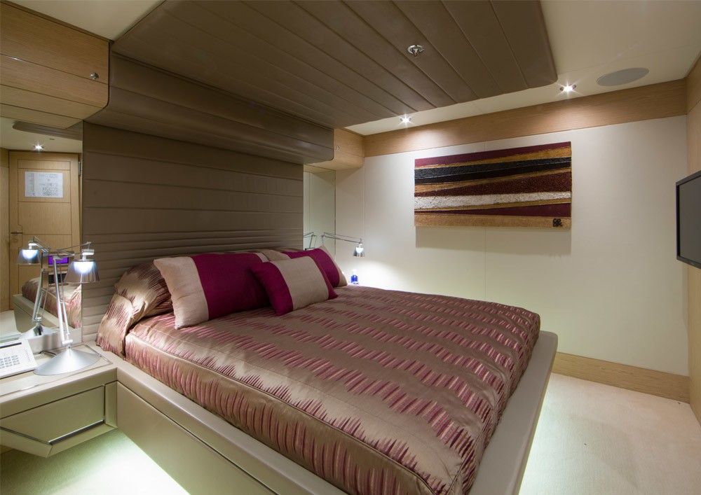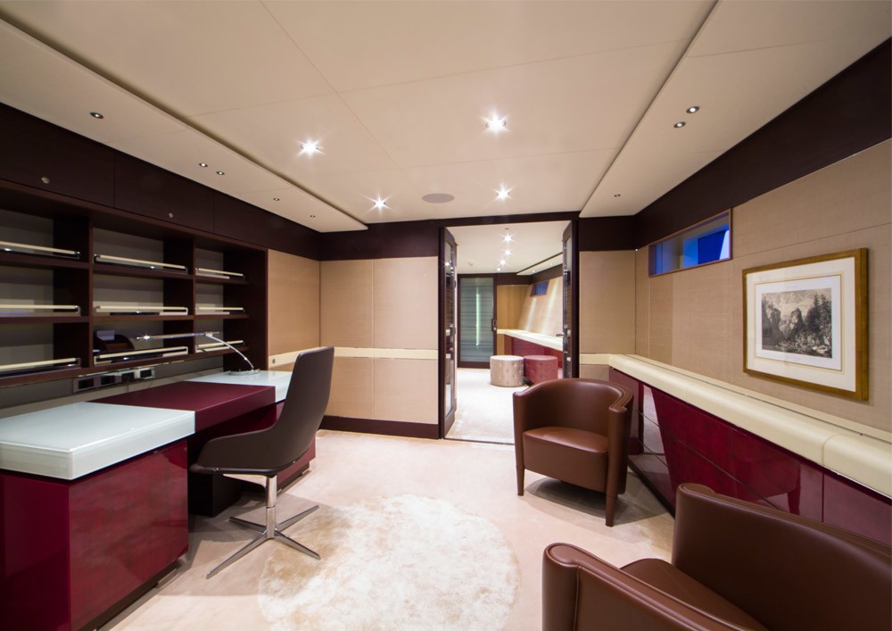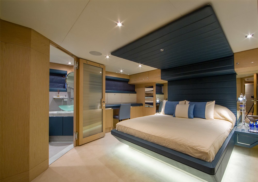M/Y ROBUSTO’s owner’s quarters are forward on the main deck. This consists of a private office/study, which then flows through to a full width master with ensuite facilities, including a whirlpool bath and separate shower. Fitted with a Californian king bed, marble covered side cabinets and finished in bird’s eye maple. This are also houses a home style theatre system with flat screen TV. The owner’s study has a custom built Anigre veneer writing desk and separate seating area.