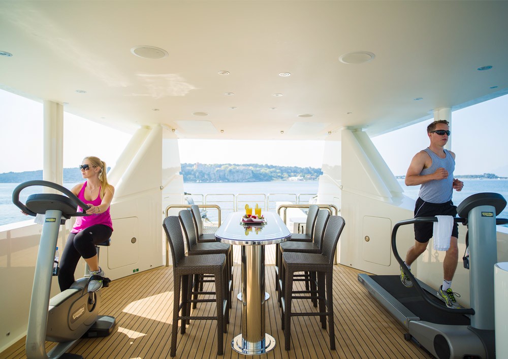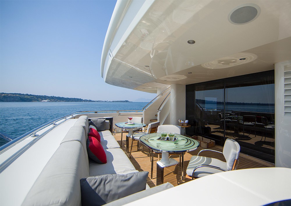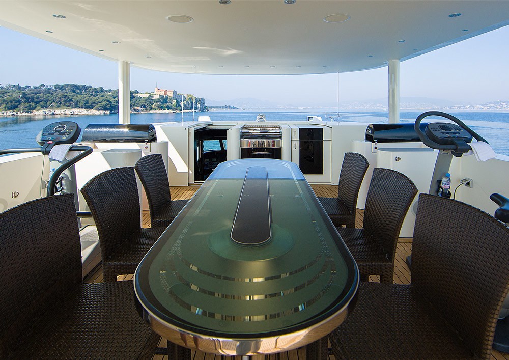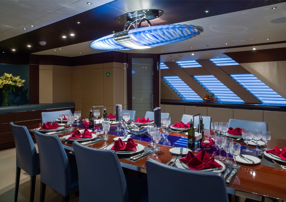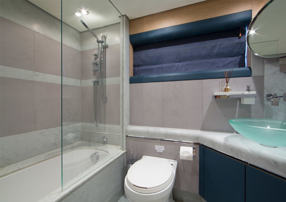 M/Y ROBUSTO’s owner’s quarters are forward on the main deck. This consists of a private office/study, which then flows through to a full width master with ensuite facilities, including a whirlpool bath and separate shower. Fitted with a Californian king bed, marble covered side cabinets and finished in bird’s eye maple. This are also houses a home style theatre system with flat screen TV. The owner’s study has a custom built Anigre veneer writing desk and separate seating area.