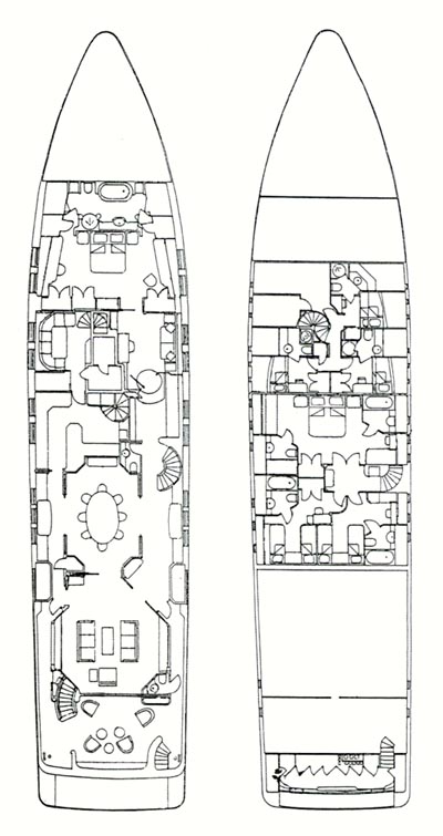 The lower deck guest accommodation consists of a full width VIP cabin with a Californian king bed, home theatre system and flat screen TV. The VIP also has his and hers ensuite bathrooms, one with a shower, one with a bath. Two twin bedded cabins with private ensuite bathrooms are also incorporated on the lower deck level.